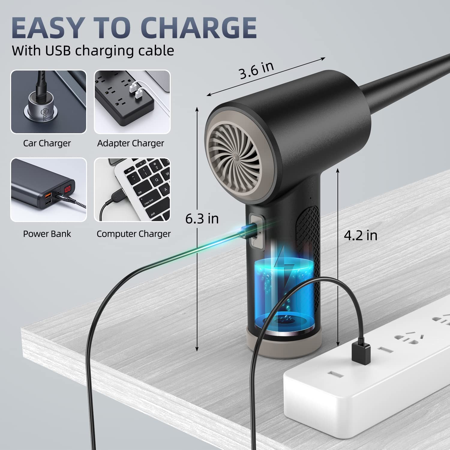 • Air duster - USB charging design:Compressed air dusters battery protection design, Do not charge when the machine just finished using, the battery temperature is too high, please wait ten minutes to cool down before charging. Compressed air dusters High-end simple new design, high technical configuration, with charging cable for use.If you have any questions about the use of the product, please contact us, we will solve it for you within 24 hours.