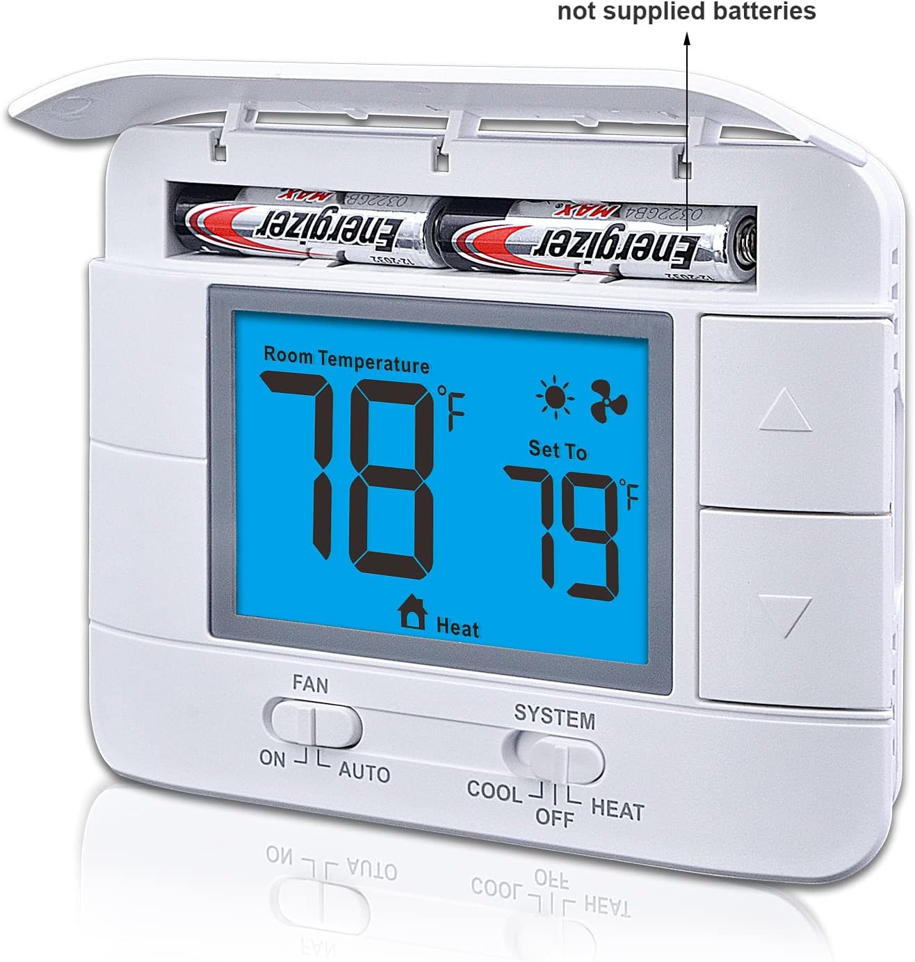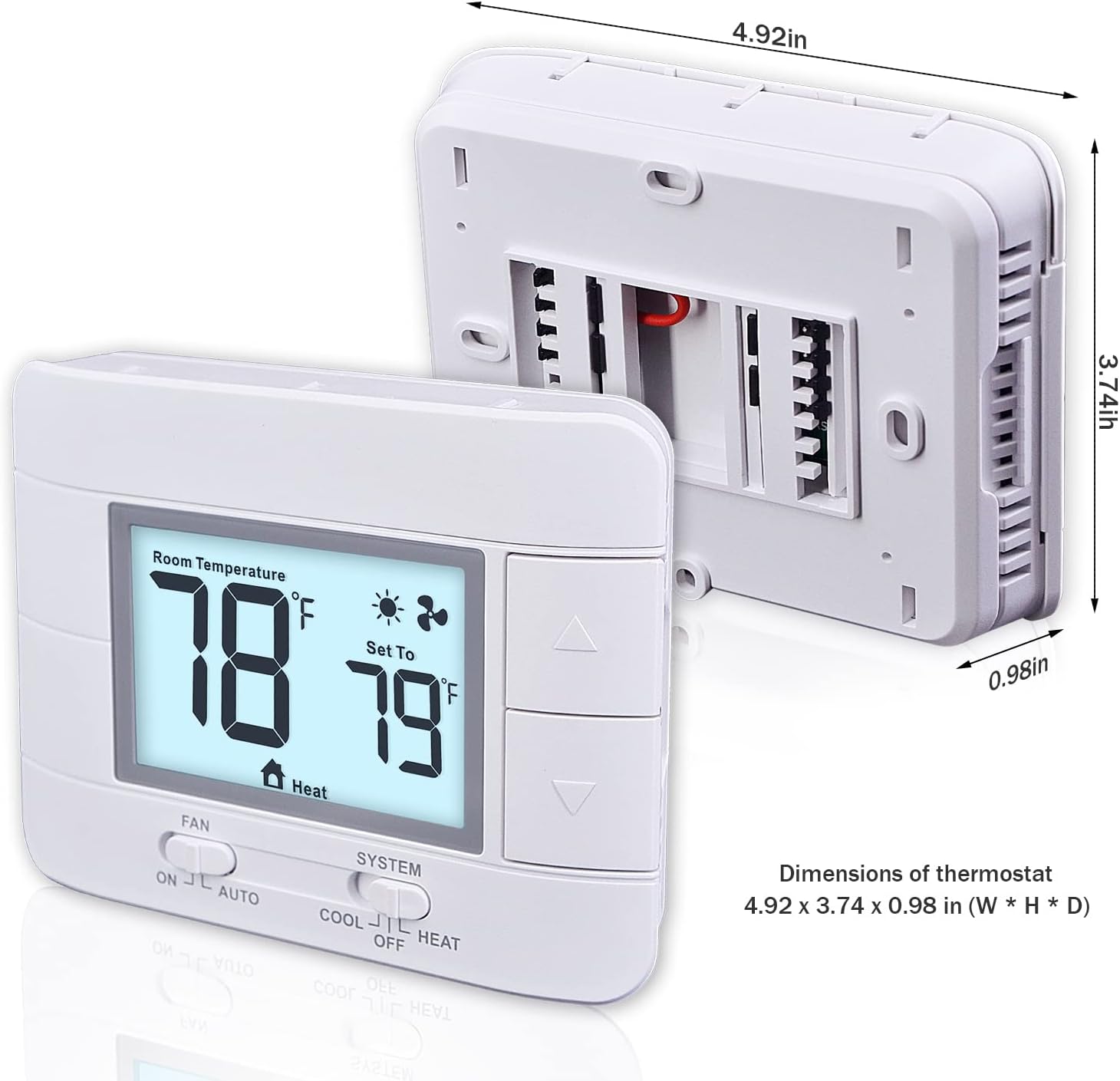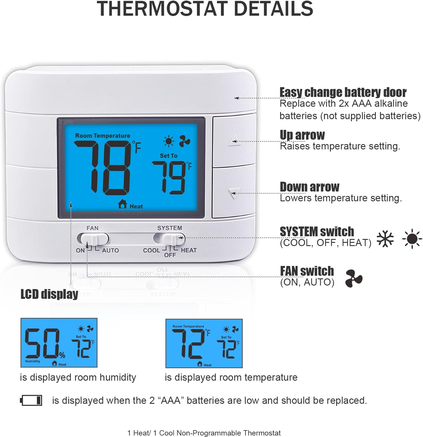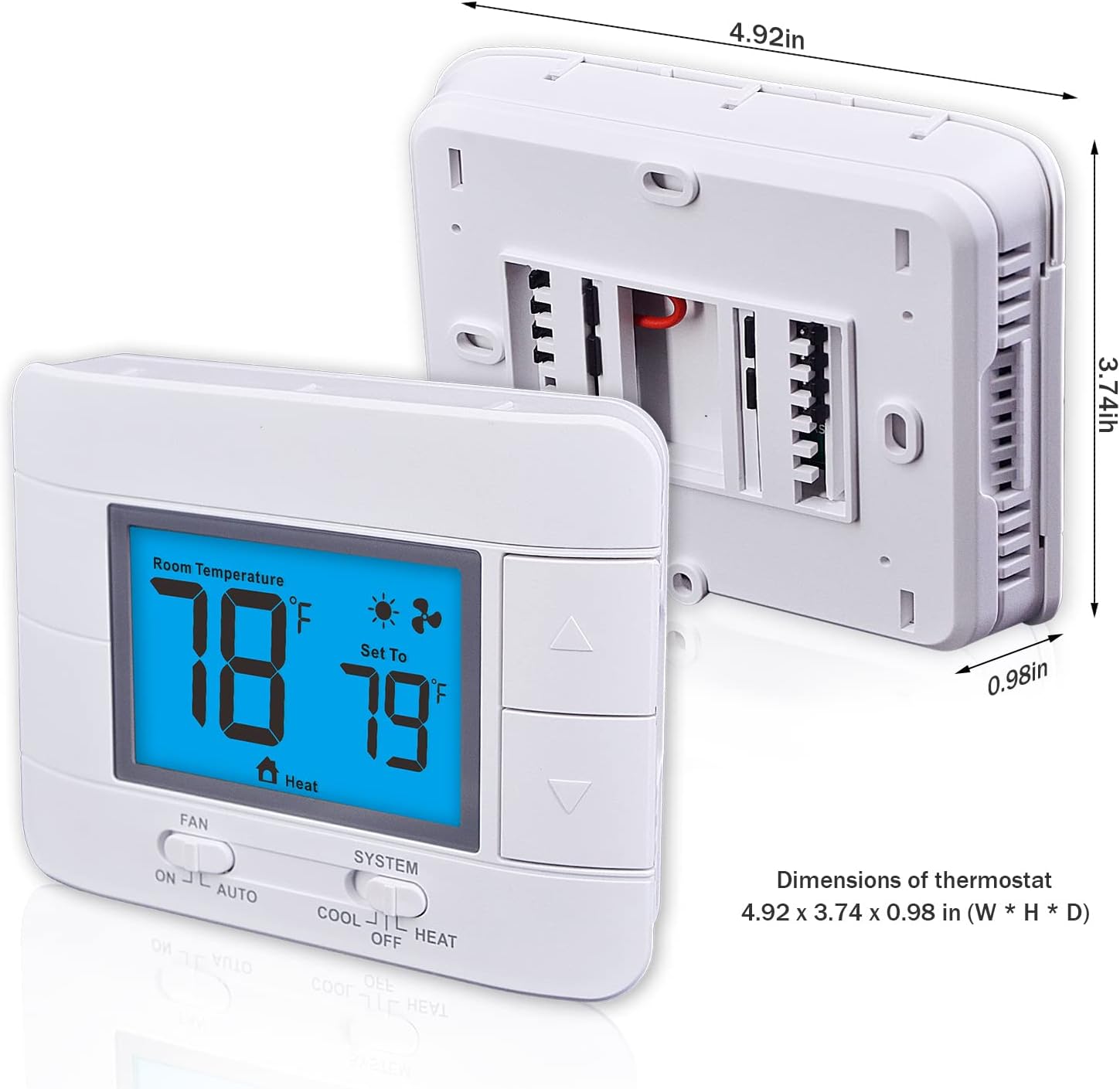 Aowel Non-Programmable Thermostat for Home 1 Heat/ 1 Cool, with Room Temperature & Humidity Monitor, 5.0 sq. in LCD Blue Backlit Screen