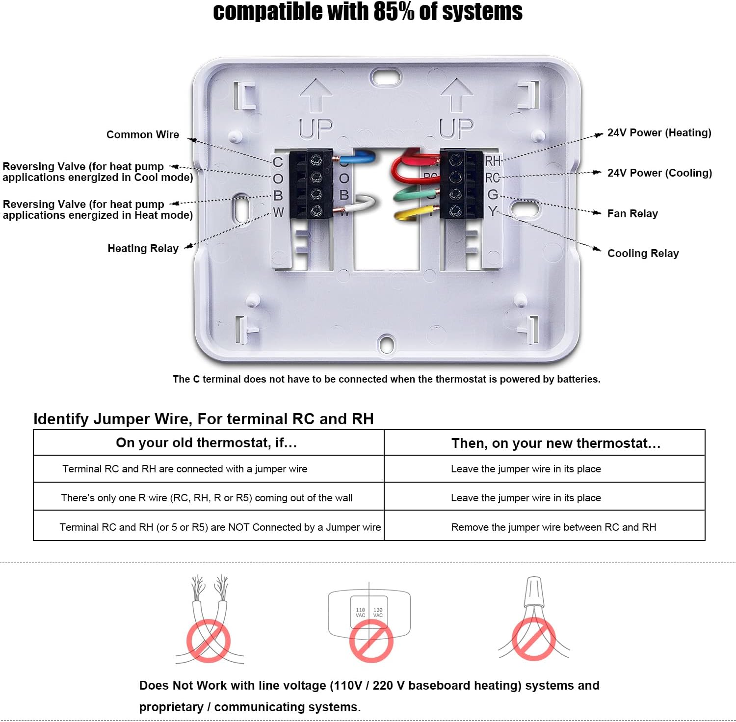 • Notice;does not work with electric baseboard heat (120v-240v) or does not work with aux heat pump and multistage systems and does not work RV.