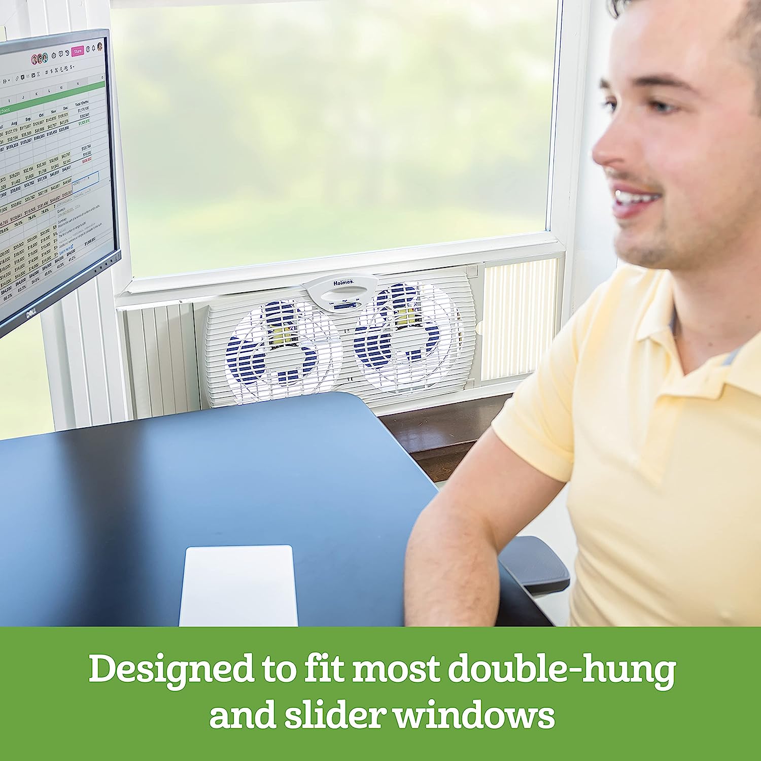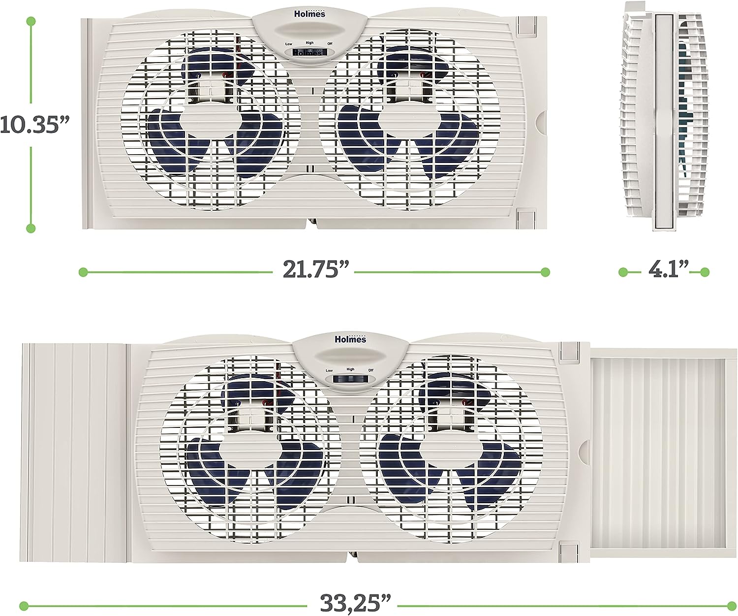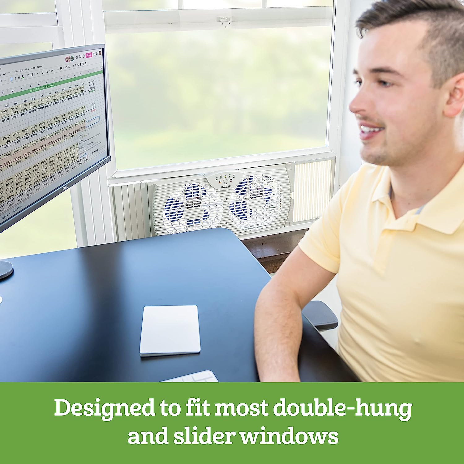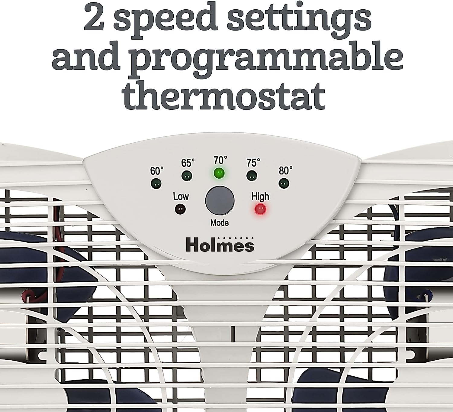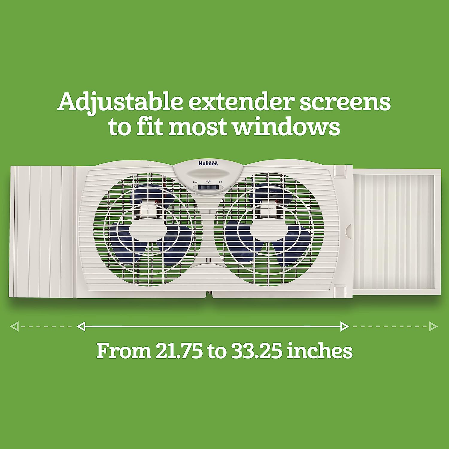 COOL YOUR HOME WITH FRESH AIR. The Holmes Digital Window Fan has dual blade operation with two speed settings and a programmable thermostat that let you maintain a set temperature and keep air flow at a comfortable level in medium-sized rooms. The dual blade fan is designed to fit most double-hung and slider windows and includes an expandable side panel with extender screen for a customized and secure fit. Designed to keep a cool breeze in your office, bedroom or any room you wish.