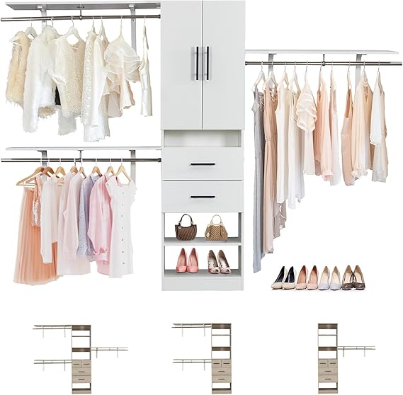 8FT Closet System with Drawers Kit(4) and 3 Hang Rods, Closet Organizer System with 3 Shelving Towers, Heavy Duty Clothes Rack, Adjustable, Built-In Garment Rack, 96"L x 16"W x 71"H, Load 1000 LBS