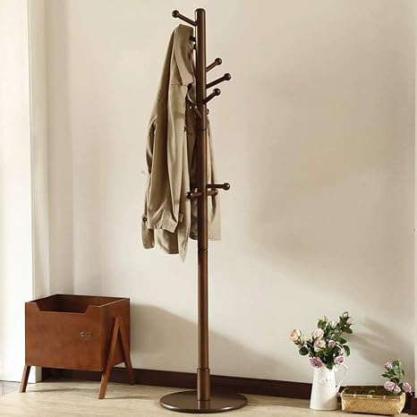 Vlush Freestanding Wooden Coat Rack Stand, Wood Hall Tree Coat Tree Hanger with 11 Round Hooks, Solid Round Base, 3 Adjustable Height for Hat, Clothes, Handbags, Umbrella, Brown