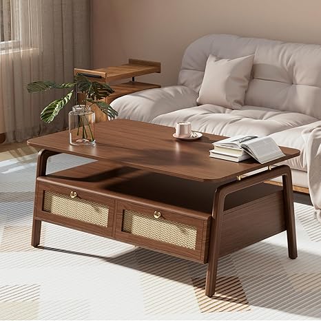 Coffee Table with Storage, Mid Century Modern Coffee Table with 4 Rattan Drawers, Coffee Tables for Living Room, Convenient for Eating, Gaming, or Working, Walnut