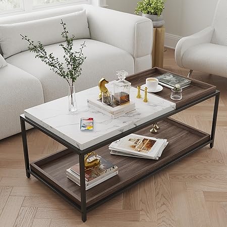 Convertible Entertaining Coffee Table - Faux Marble Coffee Table with 2 Removable Trays, 47 Living Room Table, Modern Coffee Table for Living Room, Coffee Table with Storage Furniture, Walnut