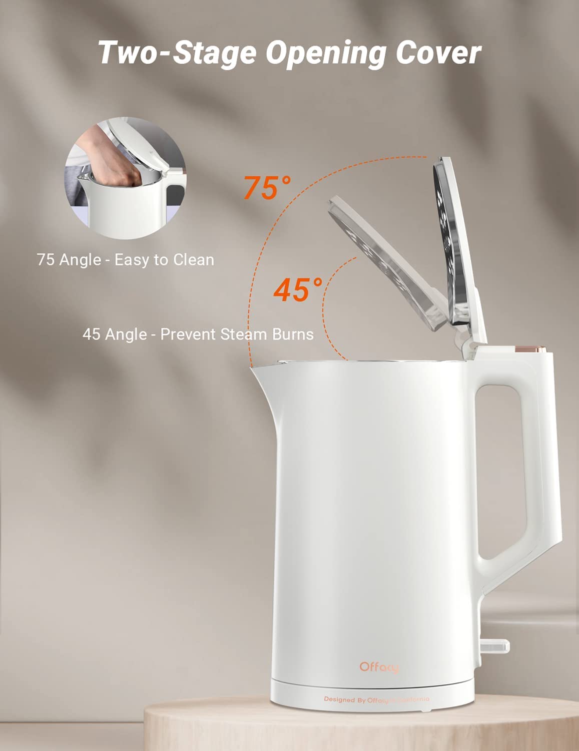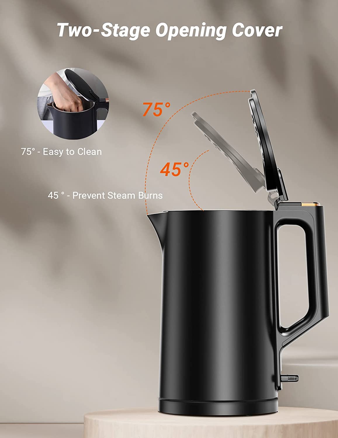• 2-Level Lid & Easy to Clean - Press the button to open the lid to 45° to avoid hot water splashing or steam. Rise the lid to 75° for easy filling and cleaning.