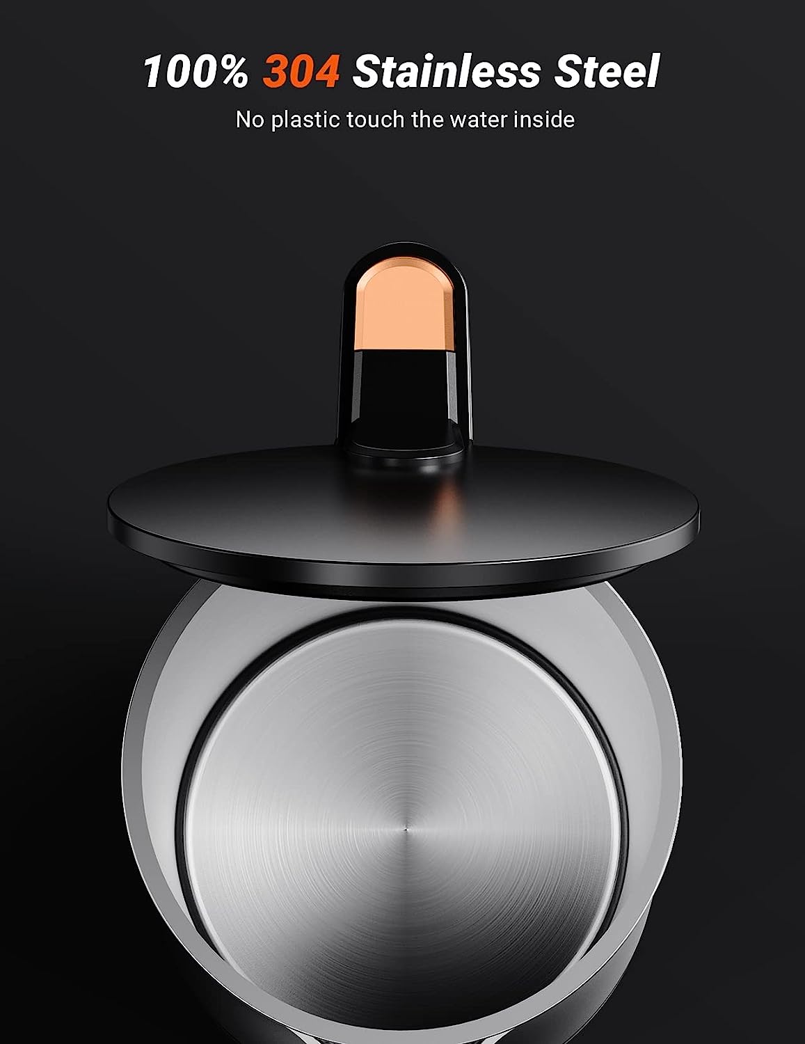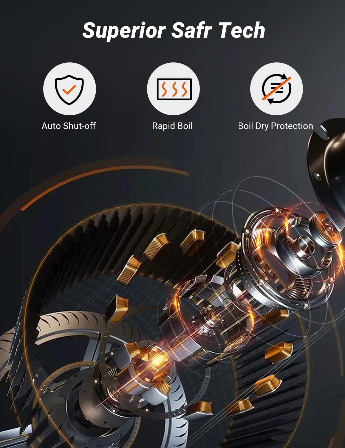 • Auto Shut-off Features - This hot water kettle electric has built-in boil-dry protection and an auto shut-off function. It will auto-switch off when the water reaches the boiling point or there is no water in the kettle.