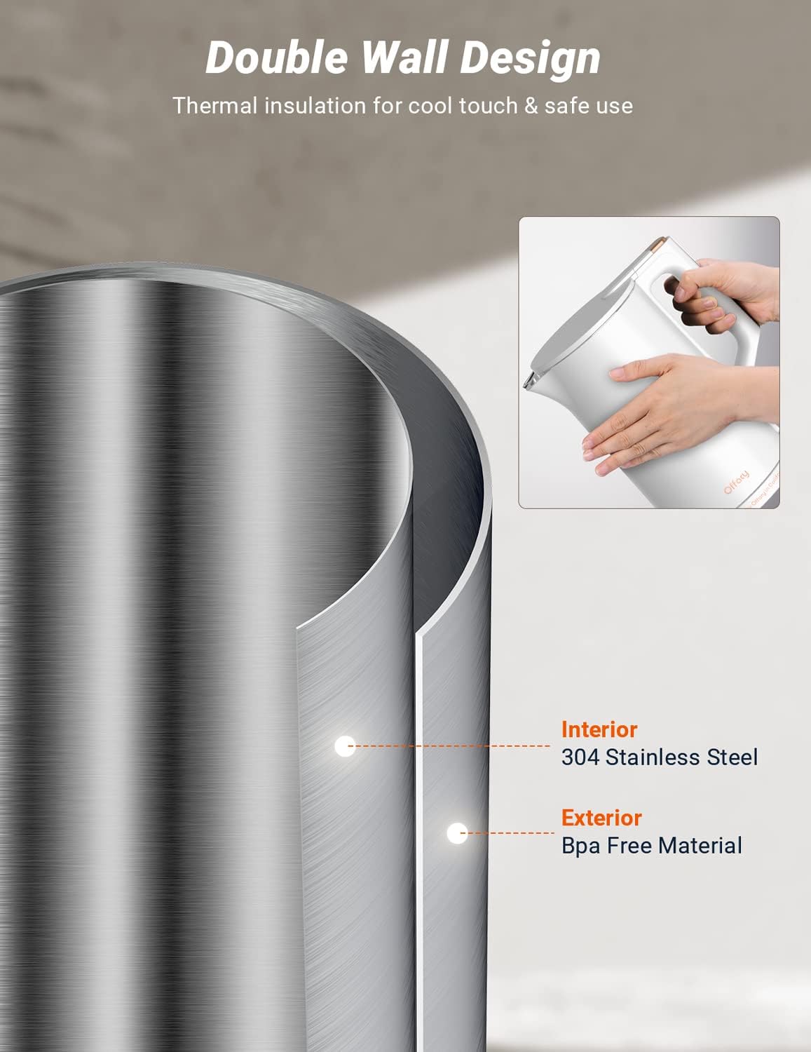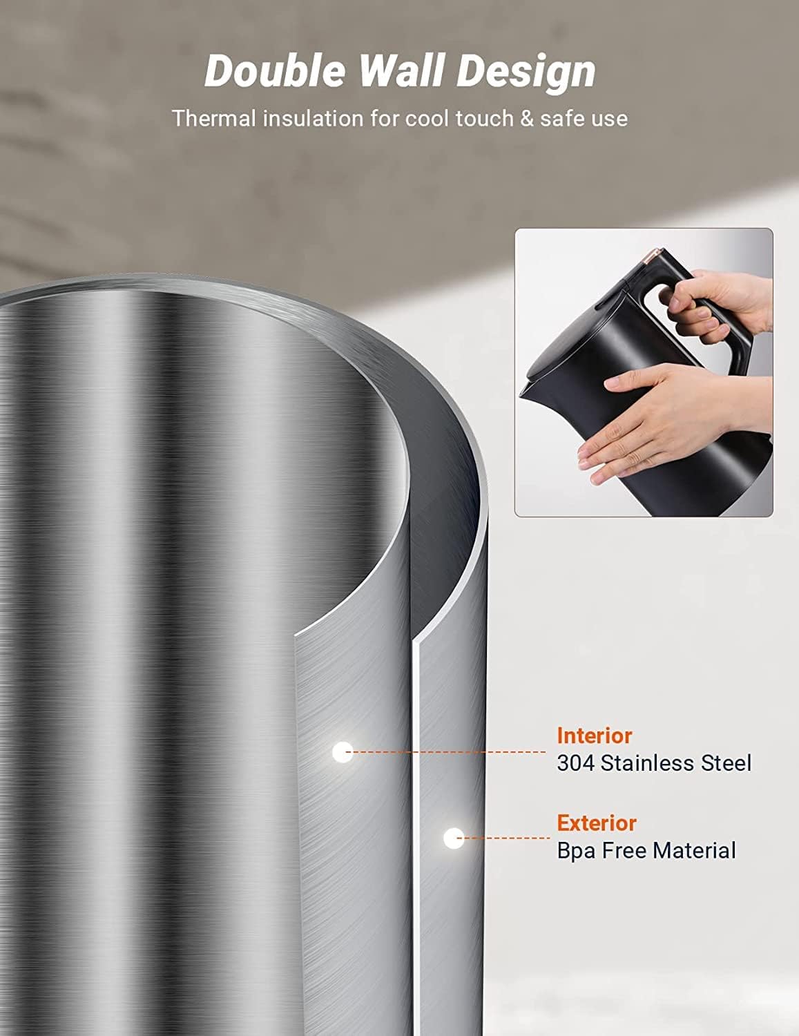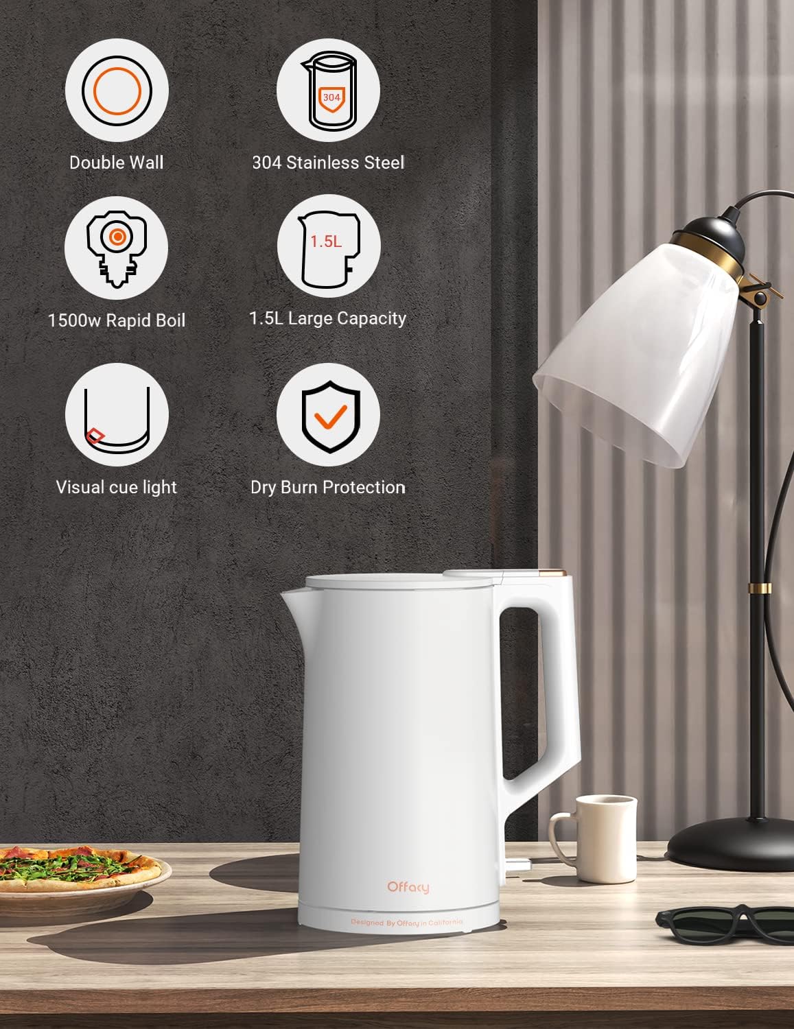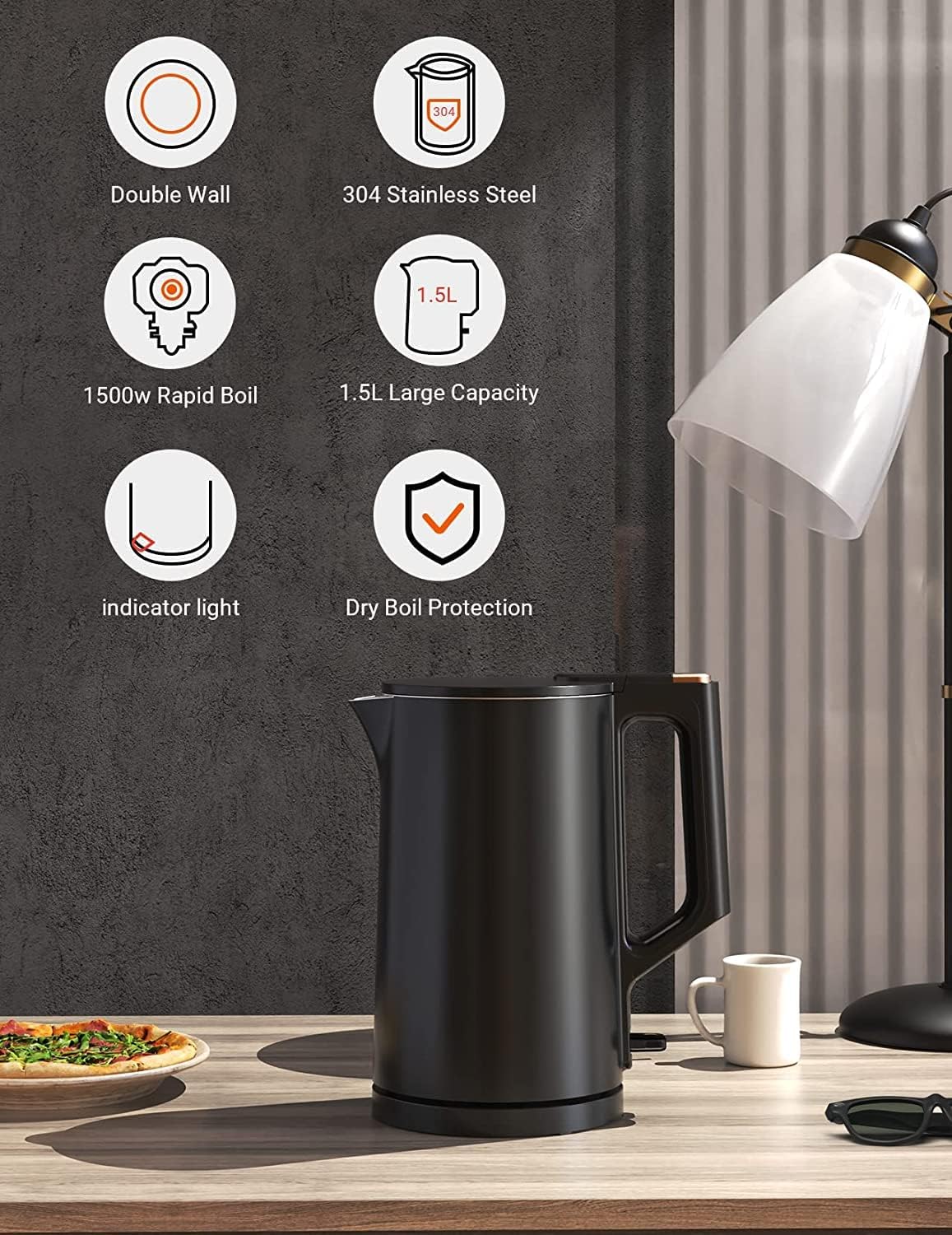 Electric Kettle, 304 Stainless Steel Interior, BPA-Free, Double Wall 1.5L Hot Water Boiler, 1500W Tea Kettle with Auto Shut-Off & Boil Dry Protection, Cordless Base & LED Indicator