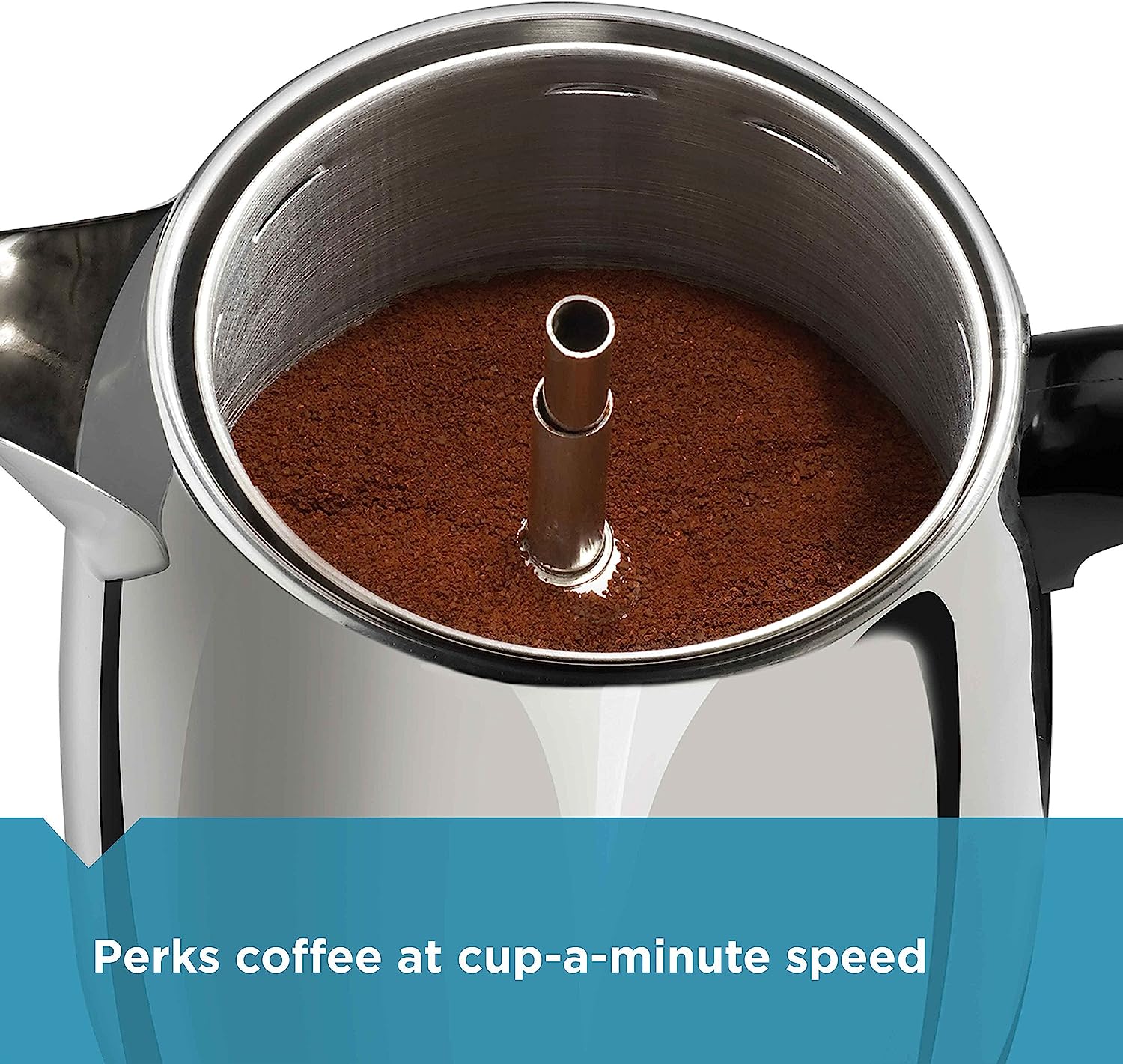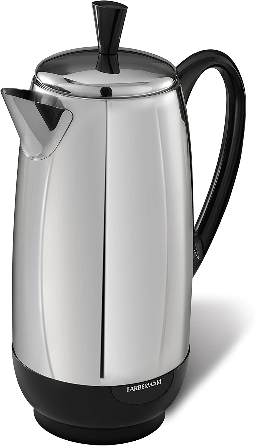 Rediscover the robust aroma and taste of percolated coffee with the FARBERWARE 2-12 Cup Stainless Steel Electric Percolator. This premium unit produces about one cup per minute, so there's no waiting around for delicious coffee. The automatic & "keep warm"; function gently warms coffee after perking, and the detachable cord makes for easy pouring and storage.