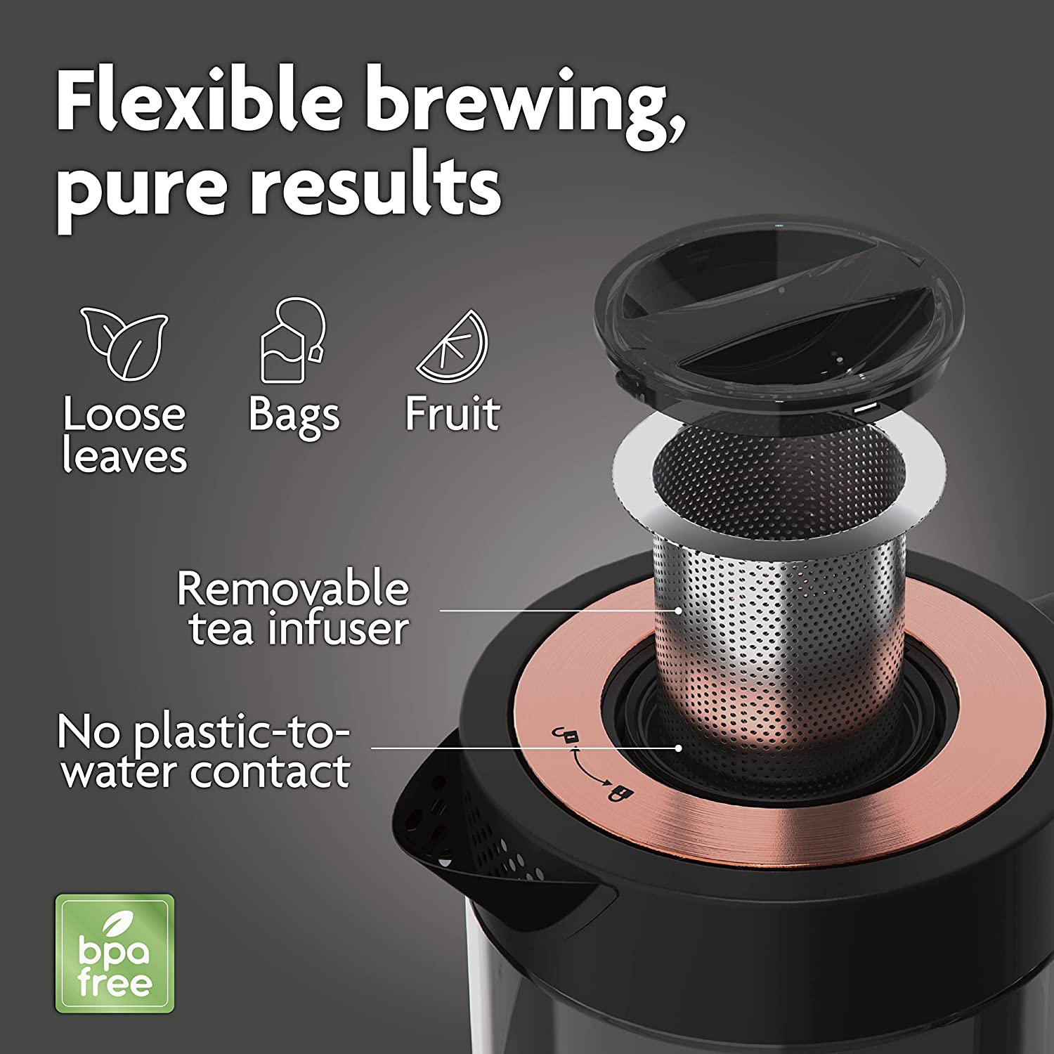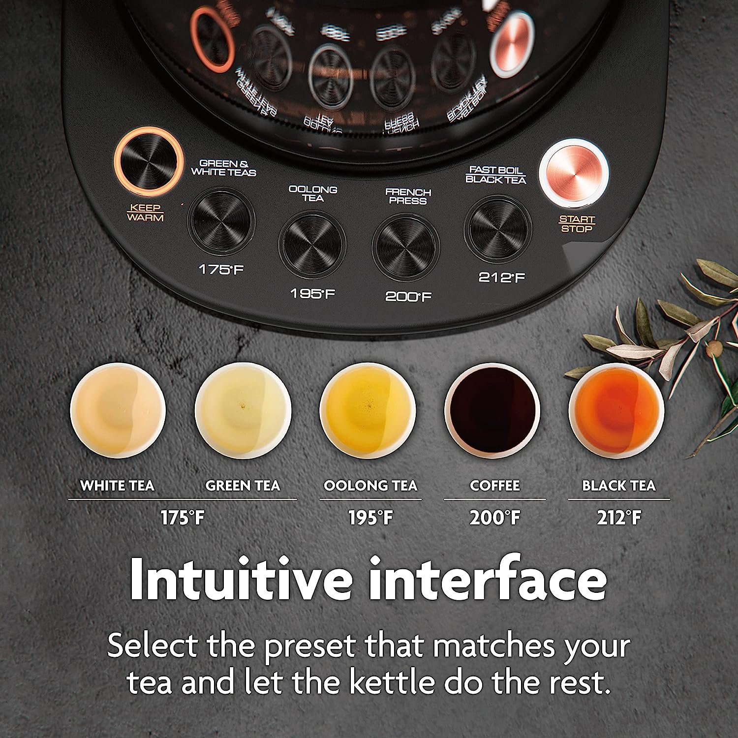 Hot Tea Maker Electric Glass Kettle with tea infuser and temperature control. Automatic Shut off. Brewing Programs for your favorite teas and Coffee.