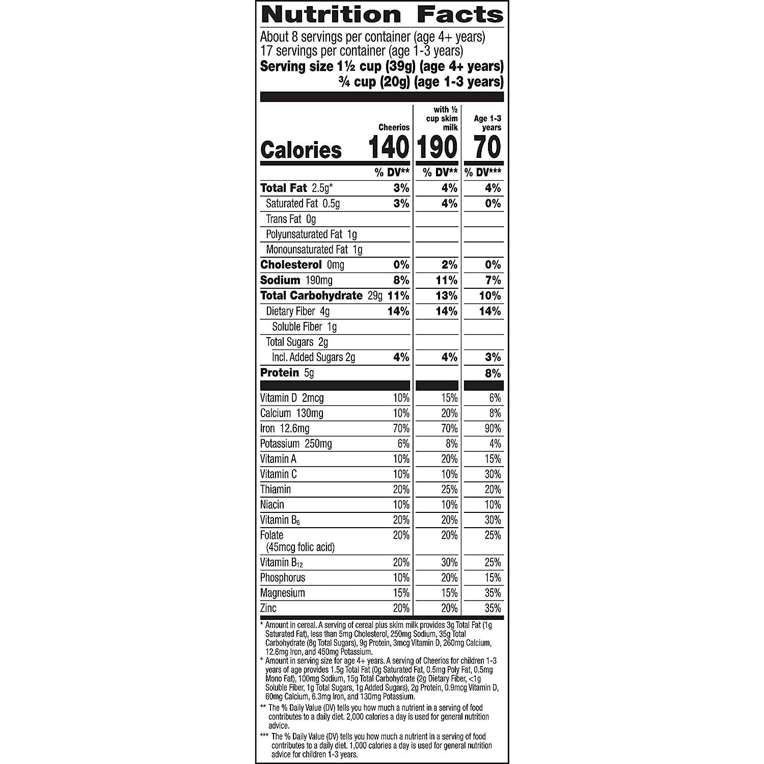 General Mills Original Cheerios Heart Healthy Cereal provides a wholesome and delicious option to start your day. Made with 100% whole grain oats, this toasted oat cereal is kosher, gluten free and made with no artificial flavors or colors. These tasty little Os are the perfect size for tiny fingers, making them a great first finger food for toddlers to eat, pick up and enjoy while practicing their self-feeding skills. Serve a bowl of this whole grain cereal for breakfast, add it to your favorite trail mix, make it into cereal bars or enjoy it out of the box for heart healthy snacks perfect for any time of day. A breakfast cereal you can feel good about, each great-tasting serving of Original Cheerios is cholesterol free and delivers 1 gram of soluble fiber and 2.5 grams of total fat. Cheerios can help lower cholesterol as part of a heart healthy diet. Three grams of soluble fiber daily from whole grain oat foods, like Cheerios cereal, in a diet low in saturated fat and cholesterol, may reduce the risk of heart disease. Original Cheerios is an official participating Box Tops product. This 20-ounce gluten free cereal box contains 14 servings and can be stored conveniently at home for a quick breakfast food or easy snacks for toddlers. Whether you're looking for delicious snacks, trail mix ingredients or a breakfast cereal for the whole family, General Mills cereals spread goodness from tots to grown-ups.