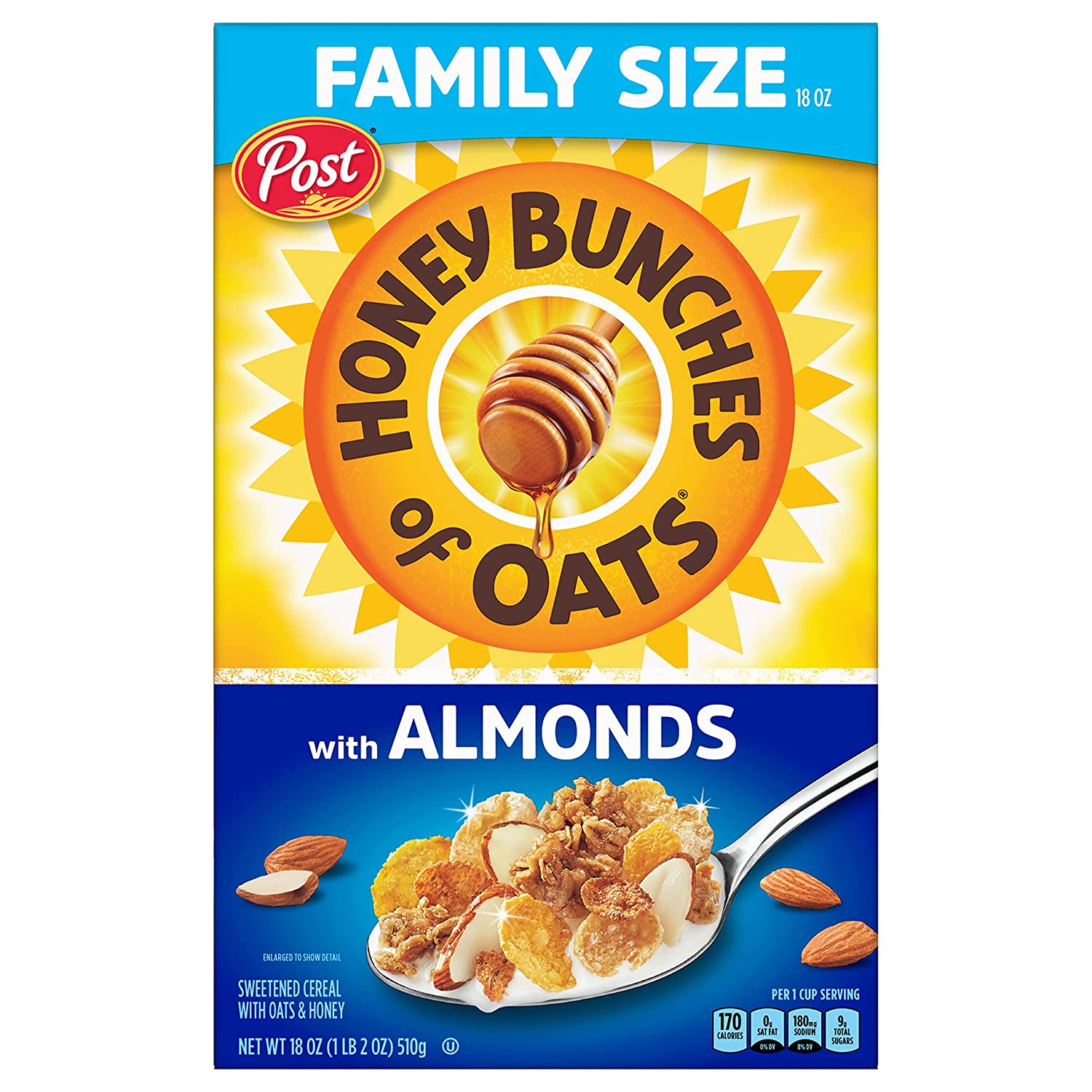 Win your morning with a bowl of Honey Bunches of Oats with Almonds cereal. Honey Bunches of Oats with Almonds is packed with 14 grams of whole grains per serving, is a good source of Vitamin D, and Zinc, and is high in vitamins B6 and folate. This heart healthy cereal is the right choice for every pantry. No need to compromise on flavor or nutrition when you have a perfect trio of crispy flakes, crunchy oat bunches, and sliced almonds. Start your day off right with Honey Bunches of Oats with Almonds cereal.