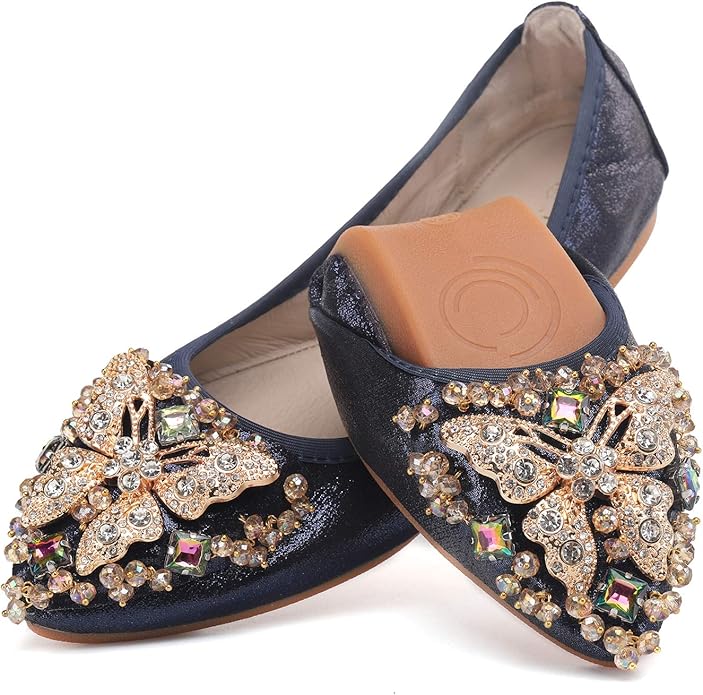 Womens Ballet Flats Foldable Rhinestone Pointed Toe Comfortable Slip on Wedding Flat Shoes Dress Flats for Women
