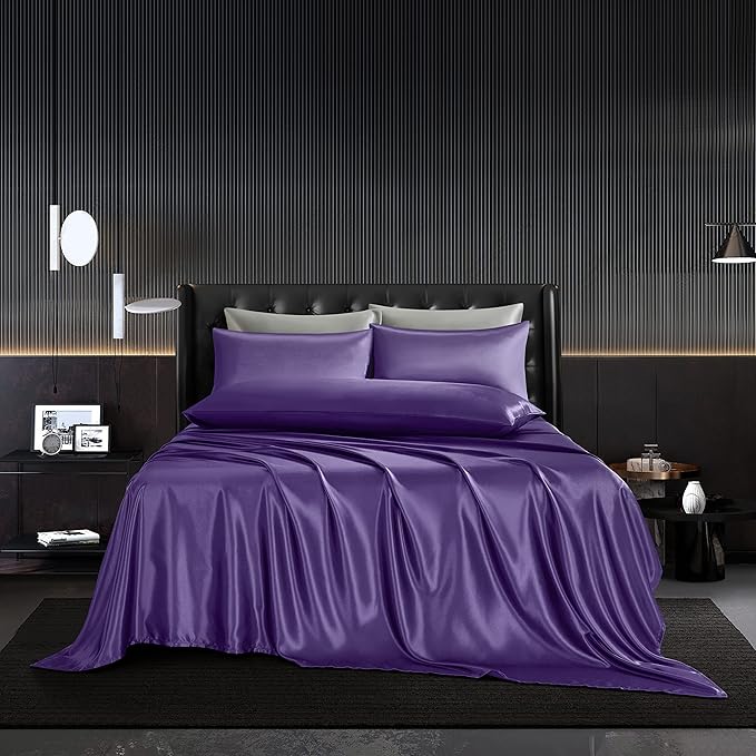 5Pcs Purple Satin Sheets Set King Size Satin Sheets Purple Silk SheetsBreathable Luxury Bedding Sheets with 1 Satin Flat Sheet, 1Deep Pocket Fitted Sheet, 3 Pillowcases