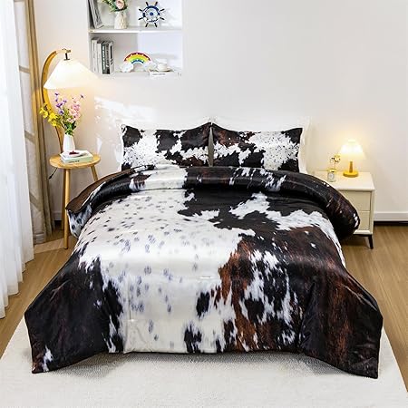 Aimuan Brown Cow Print Comforter Satin Luxury Silk Like Satin Silky Cozy Quilt Set Super Soft Cartoon Bedding Sets with 2 Matching Pillow Covers (Coffee, Queen)