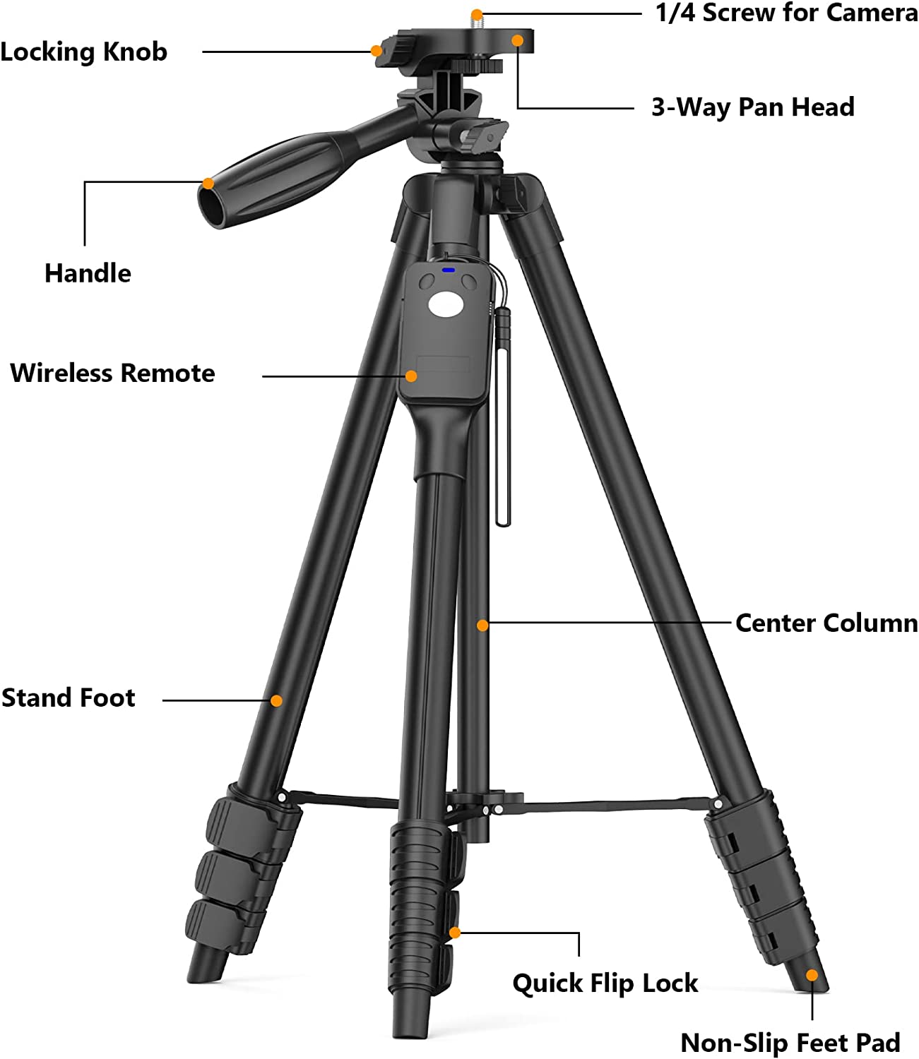 • 【Extendable Tripods】Extends from 20 to 60in with 5-section aluminum alloy telescopic rod, this camera tripod fully adapts to a range of different heights with the locking-pad locked, and enables you to create your own unique height and view while taking a picture or video.
