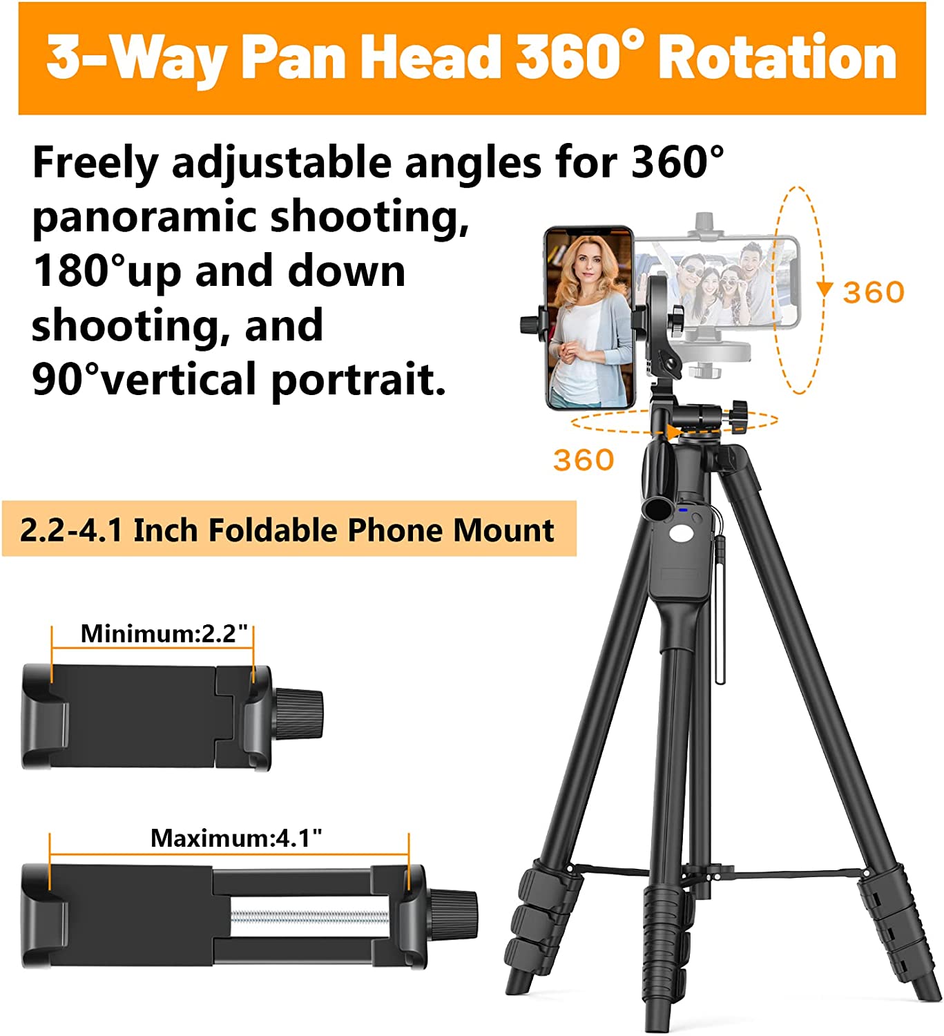 • 【Multiple Shooting Angles】With a 3-way pan head, the cell phone tripod supports 360° rotation in the horizontal and vertical directions, which creates various angles and heights for you to pick up while taking panoramic photos/videos/live-streaming. The 17 inches folded size is easy to put into your carry bag especially for traveling.