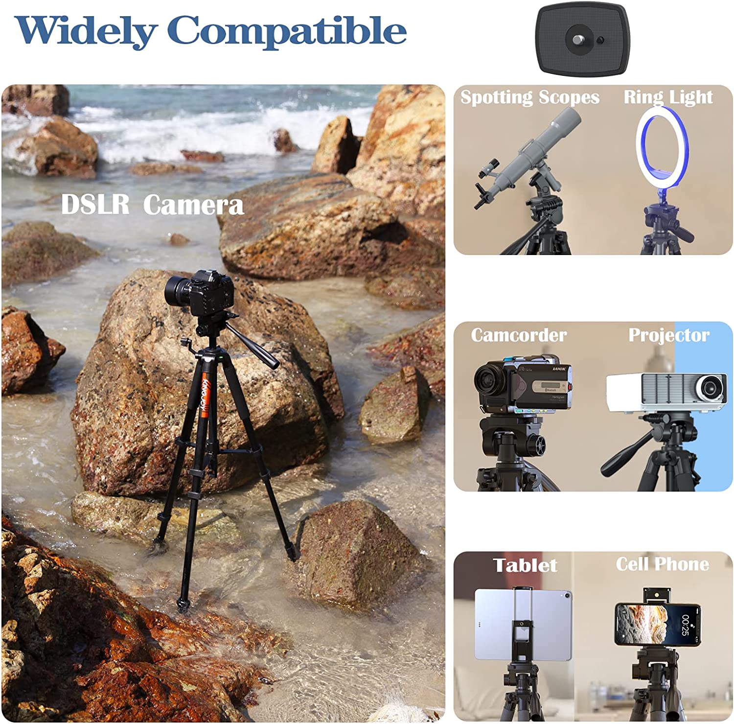 • 【Tripod for All Cameras and Phones】 with 1/4" quick release plates compatible with all Dslr, Camera, Camcorder. Canon eos rebel T5i T5 T6 T7 5D 6D R5 M50, Nikon D3200 D3400 d3500 D5200 D5600 D7500 Z50 etc. Also support Projector, Phones, Ring Light, Spotting Scopes, binoculars. equipped a stable smooth 3-way pan head can freely adjustable angles for 360° panoramic shooting.