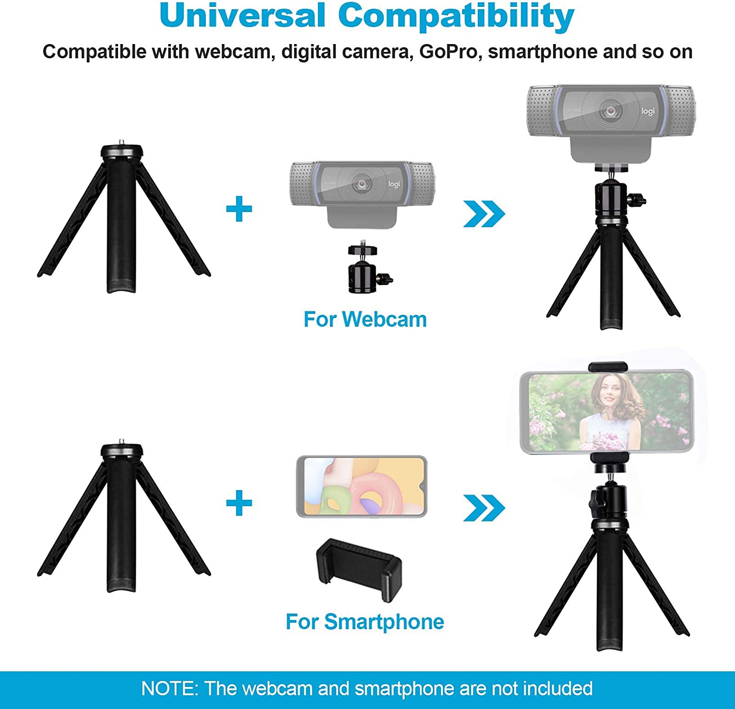 NexiGo Lightweight Mini Tripod for Camera/Phone/Webcam, Extendable Stand, for NexiGo Logitech Webcam C920 C922 C925e C922x C930e C930 C615 Brio and Other Devices with 1/4" Thread