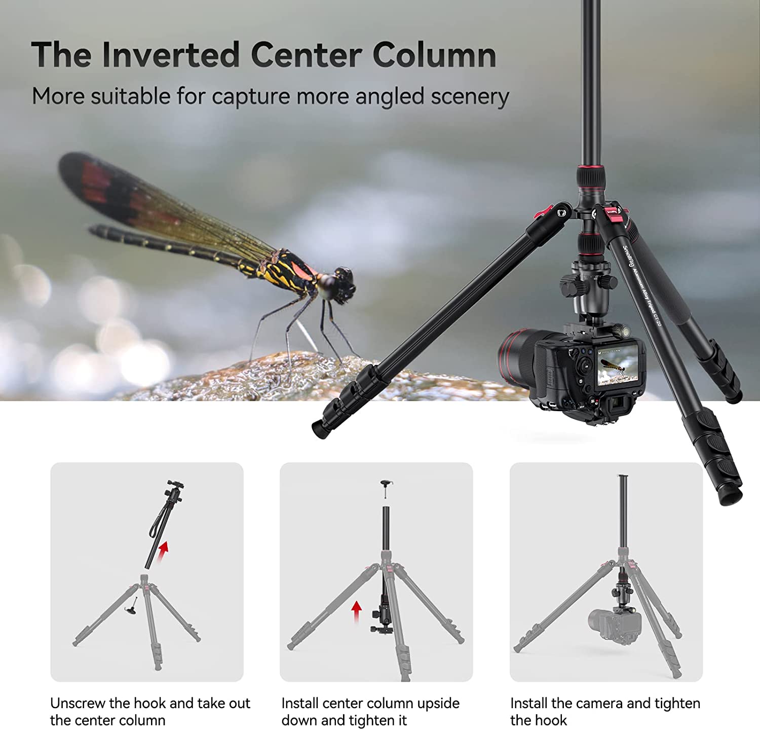 • 2-IN-1 TRIPOD & MONOPOD: The aluminum tripod can be easily turned into a monopod or walking stick, it is a good companion for you to go hiking or traveling. And the central pole can be inverted to allow for low angle shooting and macro photography.4-section column legs with 3 quick release flip-locks allows you to adjust the working height from 18.5" to 78.7" in seconds. 19.6" folden size is easily took to anywhere for outdoor photography.