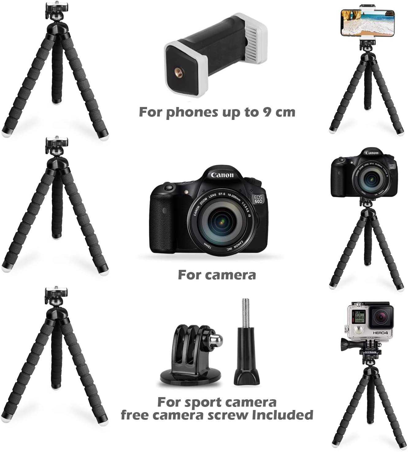 • Universal Phone Mount Adapter- Works for smartphones up to 3.54 inch wide. By a standard adaptor screw thread, it is compatible with digital cameras like Nikon/Canon, DSLR, Action Cameras (adapters Included).