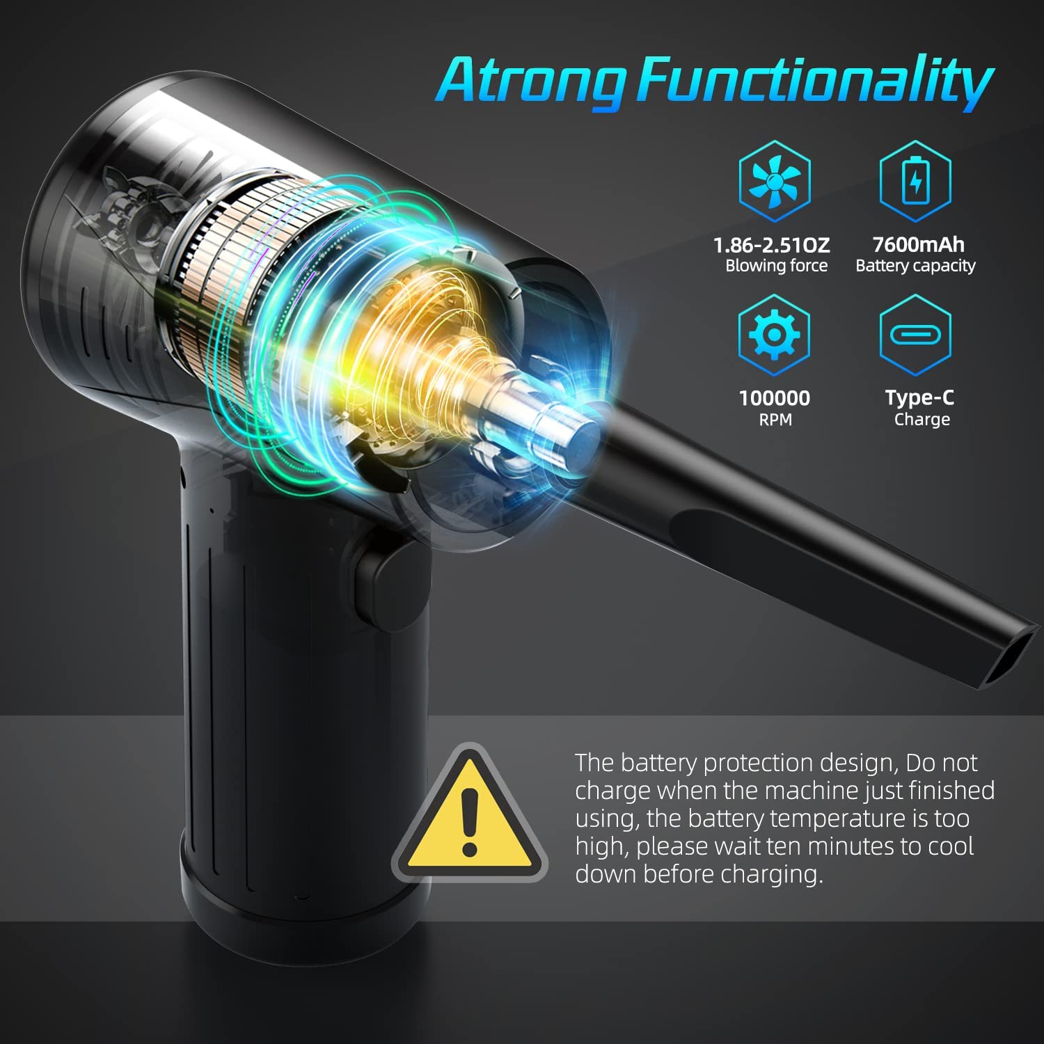 • Compressed Air Dusters:【type C charge & Easy to Carry】This cordless air dusters is easy to carry design, it's small, lightweight, comfortable to hold, and easy to cleaning homes, offices and car. 【TIP】: air duster battery protection design, Do not charge when the machine just finished using, the battery temperature is too high, please wait ten minutes to cool down before charging. -- If you have any questions about the use of the product, please contact us.