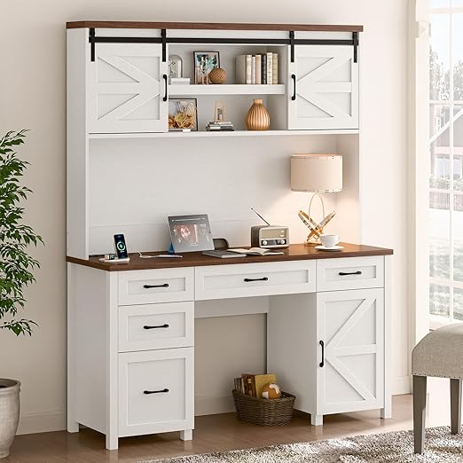 Farmhouse 47" Executive Desk with Hutch, Computer Desk with 2 Storage Cabinets & 5 Drawers, Workstation for Home Office and Study