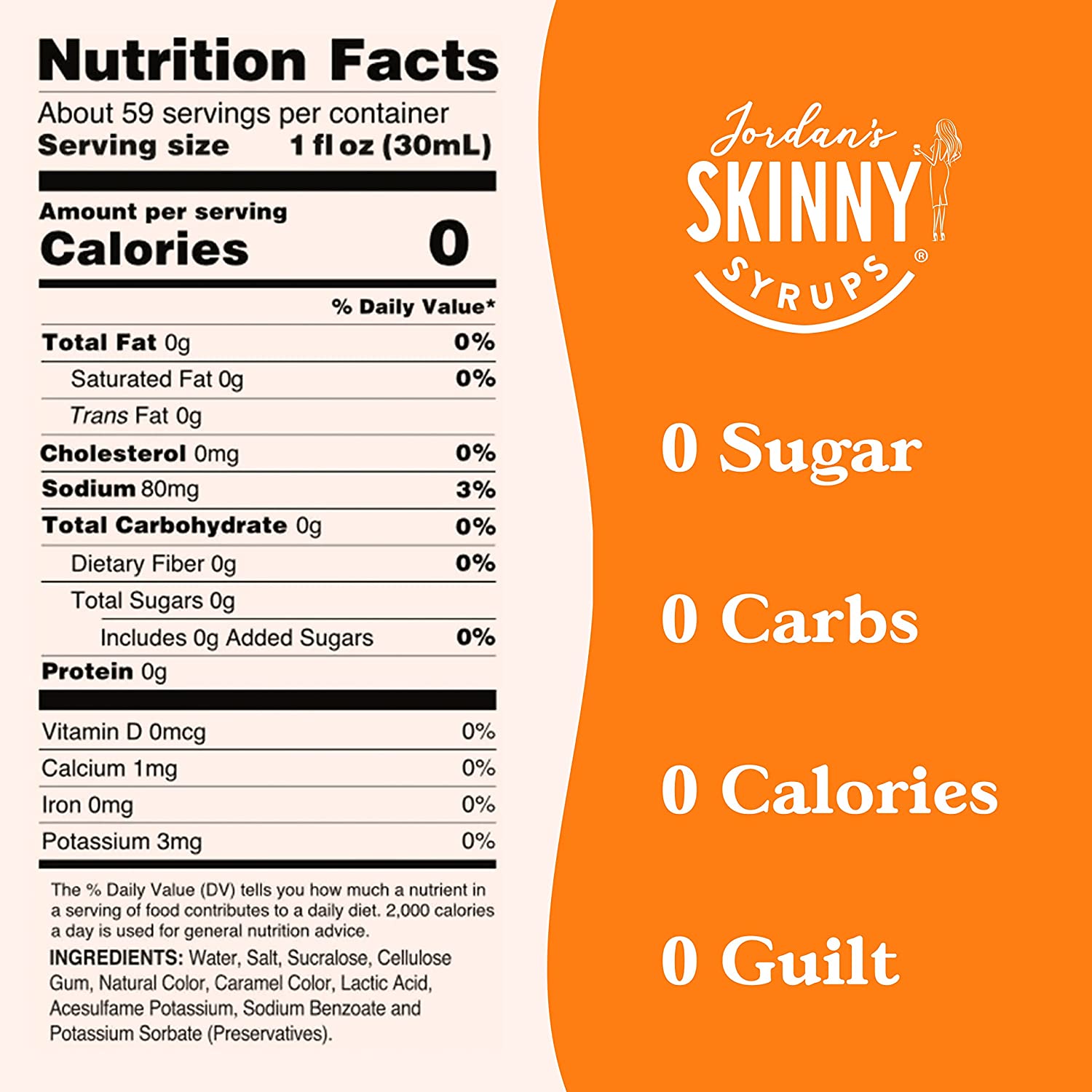 Jordan's Skinny Mixes 0 Calorie, 0 Carb, 0 Sugar Salted Caramel Coffee Syrup - the perfect way to add flavor to your coffee without the guilt! Whether you're counting calories, carbs, or sugar, this syrup has you covered. Simply add a splash to your coffee or espresso drink to give it an extra boost of flavor without any of the extra sugar or carbs. With a variety of delicious flavors to choose from, you'll never get bored of your morning cup of joe. Try Jordan's Skinny Mixes 0 Calorie, 0 Carb, 0 Sugar Coffee Syrup today and start sipping guilt-free!