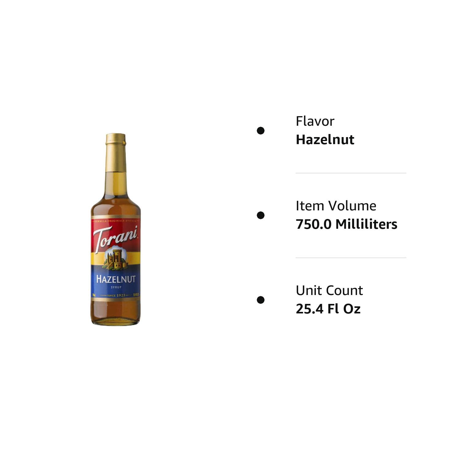 Package contains 1 Torani Hazelnut Syrup Bottle, 25.4 Fl oz (750 mL). Ahh, the hazelnut. The Italians have explored its virtues since time immemorial. And why not? Toasty and sweet, the hazelnut has made legends out of cakes and pastries. It'll do the same for your drinks. Add a splash and revel in its creamy goodness.