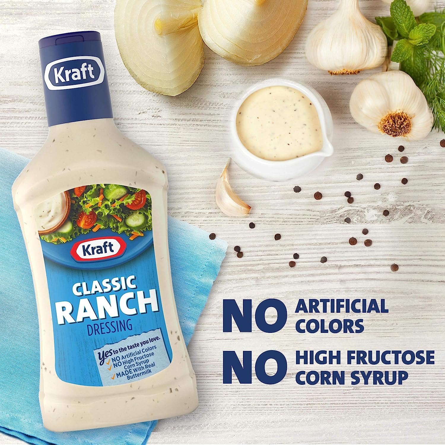 Kraft Classic Ranch Dressing adds zesty, tangy ranch flavor to almost anything. Bursting with real buttermilk and a medley of herbs and spices, this family favorite ranch dressing delivers mouthwatering flavor in every bite. Our bottled ranch is thick enough for spreading or dipping, and it adds a wonderful texture to salads. Great on all your favorite appetizers and entrees. Every bottle of Kraft Classic Ranch Dressing contains no artificial colors or high fructose corn syrup and is made with real buttermilk. Try original ranch dressing on salads and sandwiches or as a chicken dipping sauce or with fresh veggies. Each 16 fluid ounce squeezable dressing bottle comes with a convenient applicator top so you can add the perfect amount to all your favorite dishes.