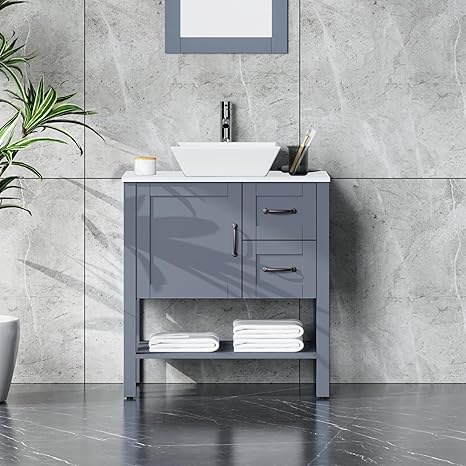 30" Gray Bathroom Vanity Sink Combo Modern Single Vessel Sink Bathroom Cabinet with 2 Drawer, Chrome Faucet, Drain, Mirror, Freestanding