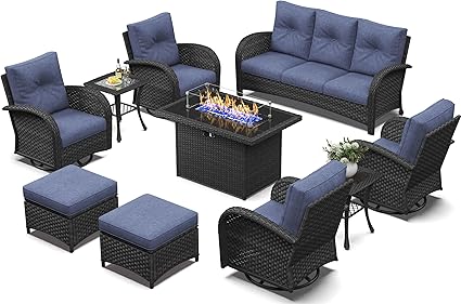 10 Pieces Patio Furniture Sets with Fire Pit Table, Wicker Rattan High Back Outdoor Swivel Rocking Chairs Set with 3-Seat Couch, Ottomans and Side Table