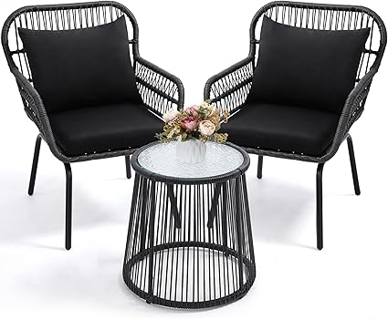 3 Piece Rattan Wicker Bistro Set, Outdoor Conversation Furniture Set with Glass Top Table, Space Saving for Balcony, Backyard, Black
