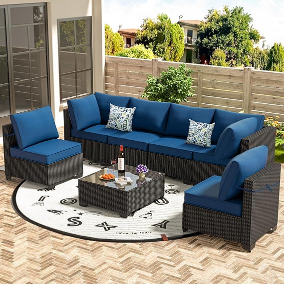 7 Piece Patio Furniture Set, All-Weather Wicker Outdoor Conversation Set with Sectional Sofa, Rattan PE Wicker Seating, Glass Coffee Table, and Cushions (Coffee-Peacock Blue, Z7)
