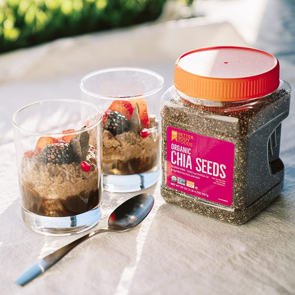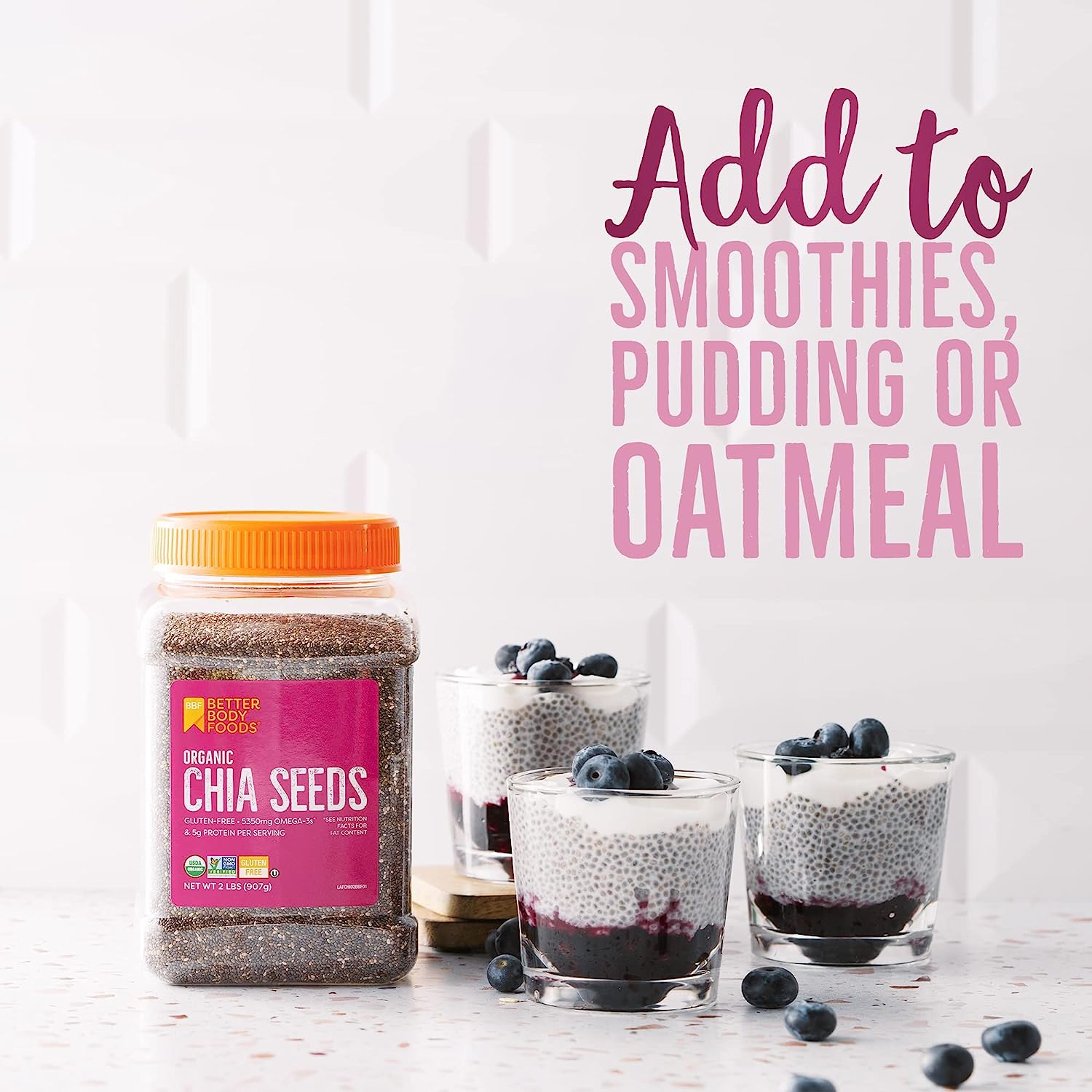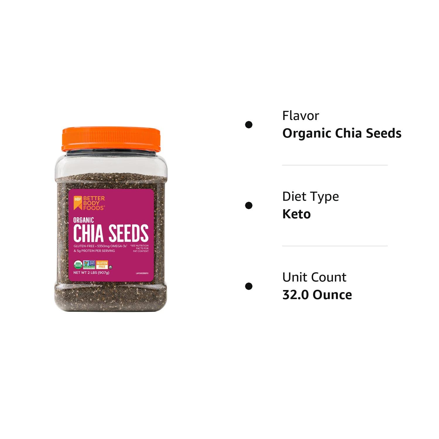 Finding foods with lots of nutrients can be helpful for people who are trying to change their diet and live a better life. The word “chia” comes from the ancient Mayan word for strength. Why would the Mayans use such a powerful word for such a small seed? Well, chia seeds are loaded with nutrients such as fiber and omega-3 fatty acids. Our Organic Chia Seeds are nutrient powerhouses which is why they deserve to be associated with strength. They contain 37% of the daily recommended value of fiber to help the 97% of Americans who are fiber deficient. Because our chia seeds are flavor neutral and flavorless, you can add them to just about anything to get a boost without changing the taste of your food. Just mix our chia seeds with your favorite breakfast shake, smoothie, bread batter, or other food that could use a little extra crunch that your family will love! Use them as a pre-or post-workout boost with protein powders that you are already using. You can also sprinkle the seeds as a topping on yogurt, salads, or cereal for a satisfying snack! Our Organic Chia Seeds also make a great egg replacement. Just mix 1 tbs. of chia seeds with 3 tbs. of water and let it sit for 5 minutes. Then use it as a vegan egg substitute in your favorite recipes. These Organic Chia Seeds are gluten-free, vegan, nut-free, raw, low-carb, non-GMO, and paleo-friendly, making them the perfect powerhouse for your pantry. BetterBody Foods is determined to bring you quality products that are better for your body but that don’t make you sacrifice the flavors that you enjoy. Find food that you’ll love to love with our 2 lbs. bulk container of Organic Chia Seeds!