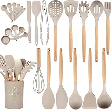26 Pcs Kitchen Utensils Set with Holder, Large Silicone Cooking Utensils Set for Nonstick Cookware Wooden Handle Spatulas Silicone Heat Resistant Kitchen Gadgets Utensil Sets (Khaki)