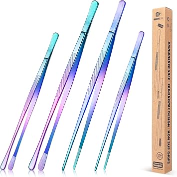 4 Pcs Fine Long Tweezer Tongs Professional Rainbow, 12'' and 10'' Stainless Steel for Kitchen, Food, Cooking, Repairing, Sea food and BBQ