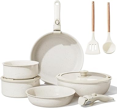 11 Pcs Pots and Pans Set Non Stick with Removable Handles, Ceramic Cookware Set Non Toxic, Induction Kitchen Cooking Sets, Nonstick RV Cookware, Dishwasher/Oven Safe, PFAS/PTFE/PFOA Free, Cream White