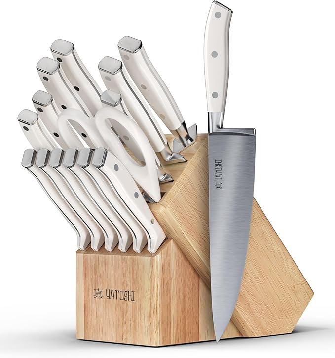 Yatoshi 15 Piece White Knife Block Set - Pro Kitchen Knife Set Ultra Sharp High Carbon Stainless Steel with Ergonomic Handle