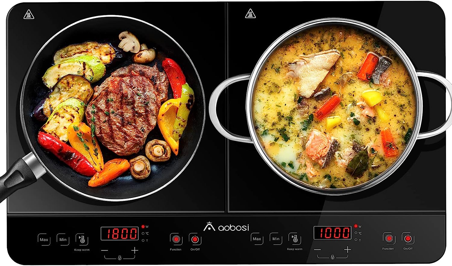 Aobosi Double Induction Cooktop,Portable Induction Cooker with 2 Burner Independent Control,Ultrathin Body,10 Temperature,1800W-Multiple Power Levels,4 Hour Timer,Safety Lock