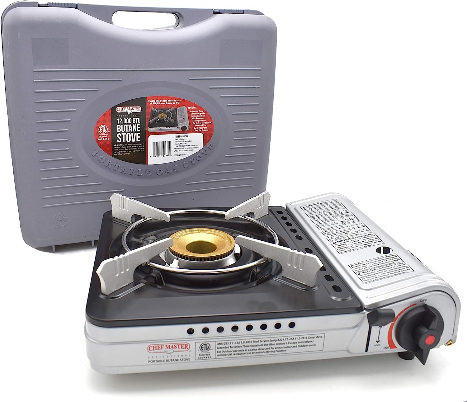 • CAMPING AND BACKPACKING ESSENTIALS: The Chef Master 12,000 BTU Portable Butane Camping Stove is essential for any camping or backpacking trip. This butane stove has a hard-shell carrying case which means that this unit is extra portable! The stove is small enough to easily fit in a hiking backpack or in a camping bag