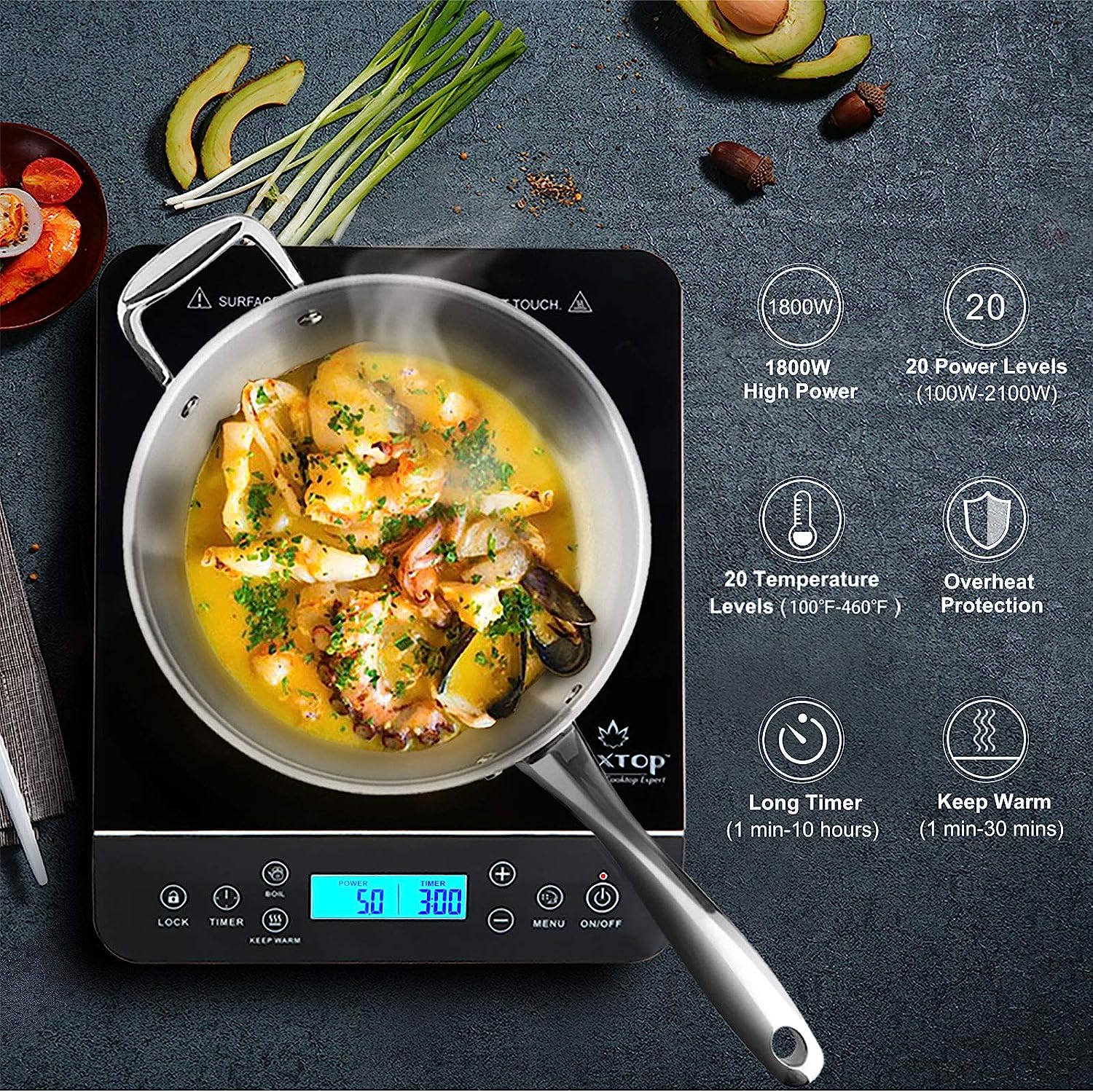 • 【DIGITAL LCD SENSOR】Touch control panel: child safety lock keeps the cooking and timer settings from being accidentally changed once they have been set; fast boil button; keep warm button (for 1-30 minutes at 140°F); up to 10-hour timer button.