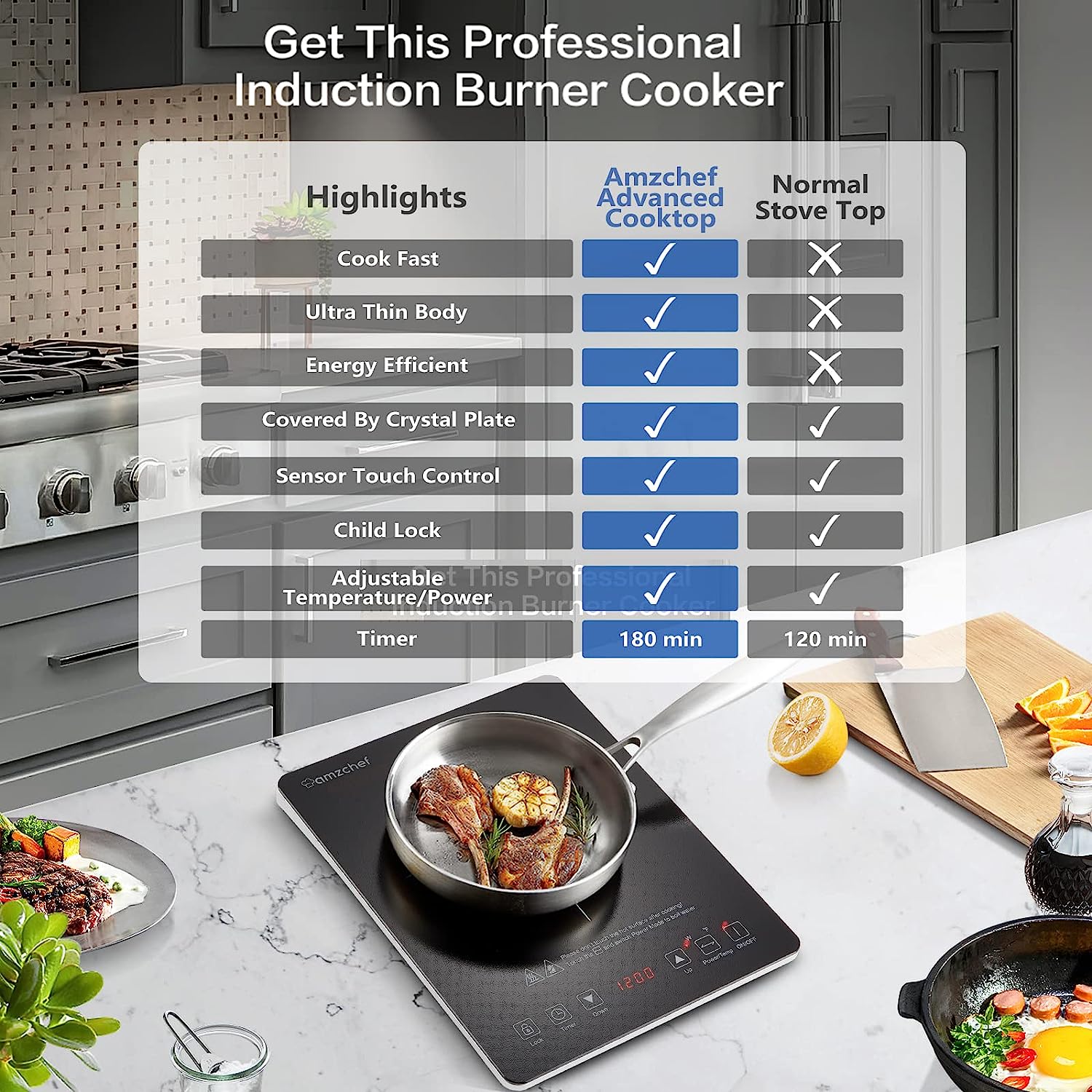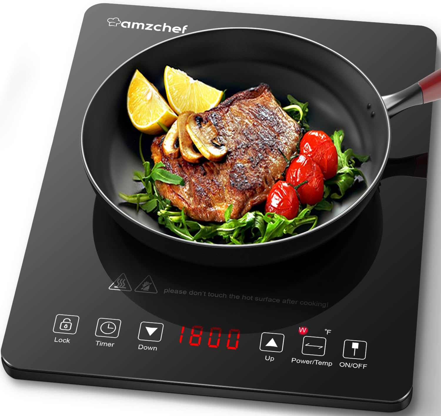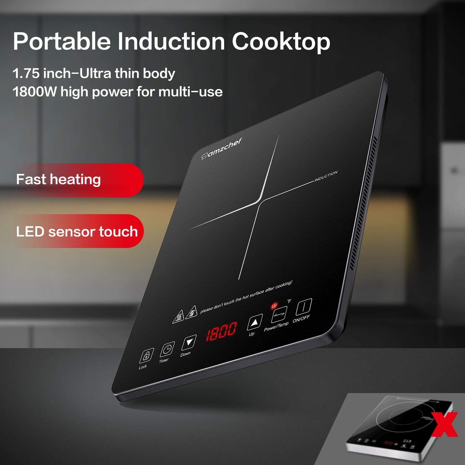 Portable Induction Cooktop AMZCHEF 1800W Induction Stove Burner With Ultra Thin Body, Low Noise Hot Plate With Sensor Touch Single Electric Cooktops Countertop Stove With 8 Temperature & Power Levels, 3-hour Timer, Safety Lock