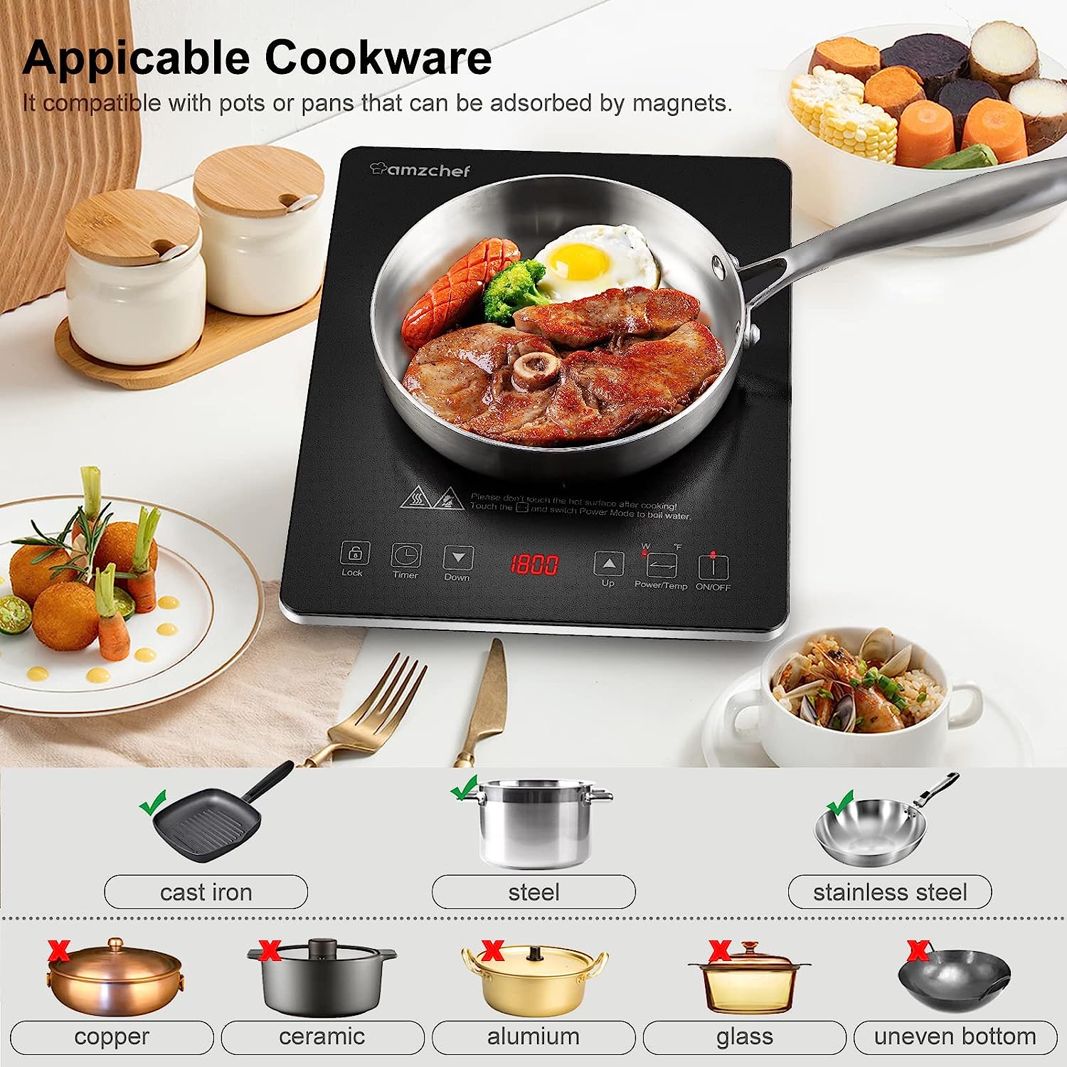 • 🥘Compatitable Magnetic Cookware- The induction hot plate works with magnetic induction cookware like cast iron, iron, steel, and enameled iron cookware (diameter is between 4.72in-10.23in). The auto-pan detection will shut the unit off automatically after 60 seconds if no cookware, or the incorrect cookware is detected.