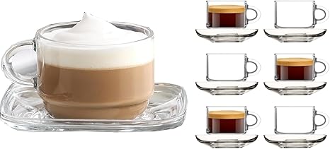 BOHEM'S Espresso Cups, Stackable Espresso Set of 6, Small Demitasse Clear Glass Espresso Drinkware, Cups and Saucers, Espresso Shot Glasses, Clear Expresso Coffee Cups, Tazas de Cafe Expreso (3 OZ)