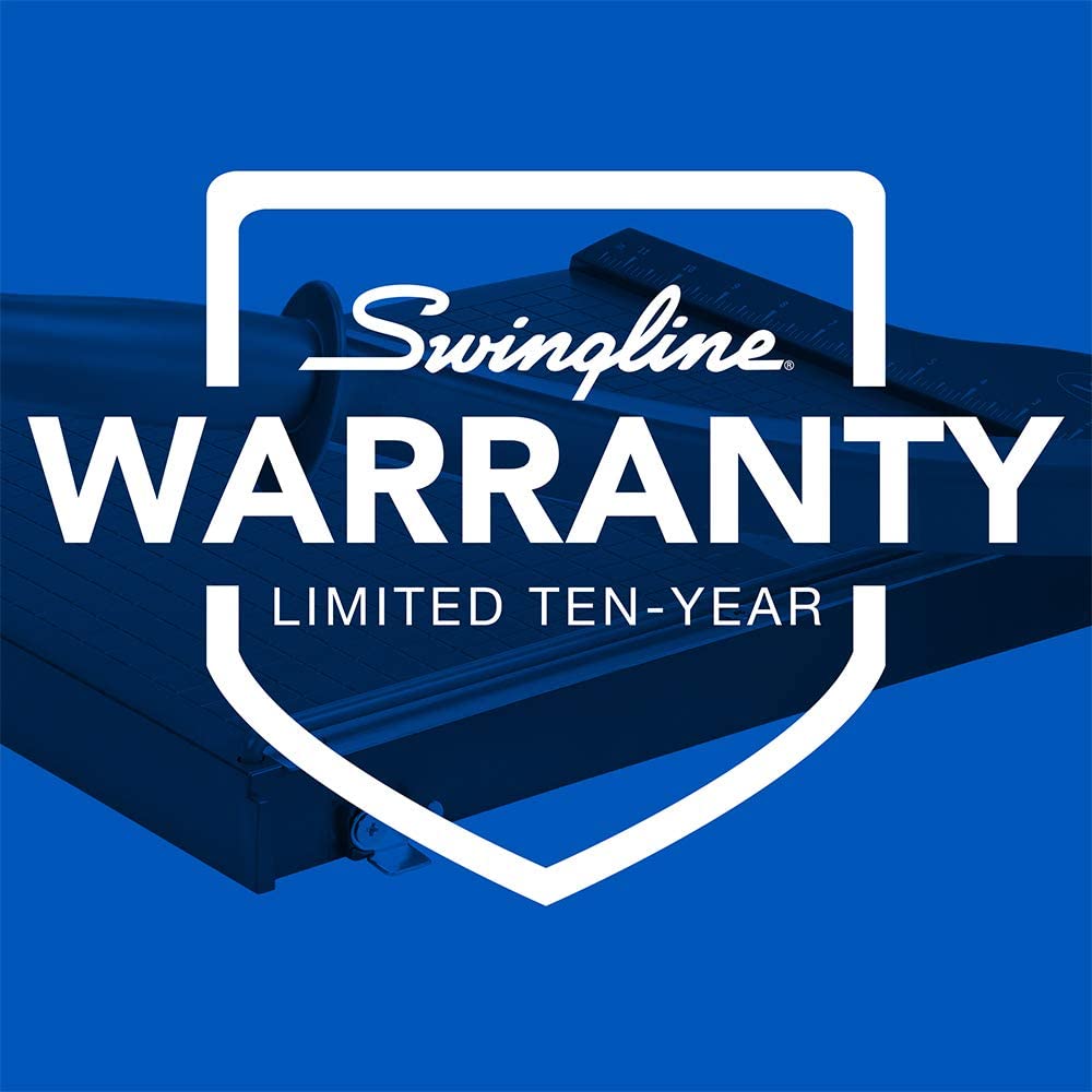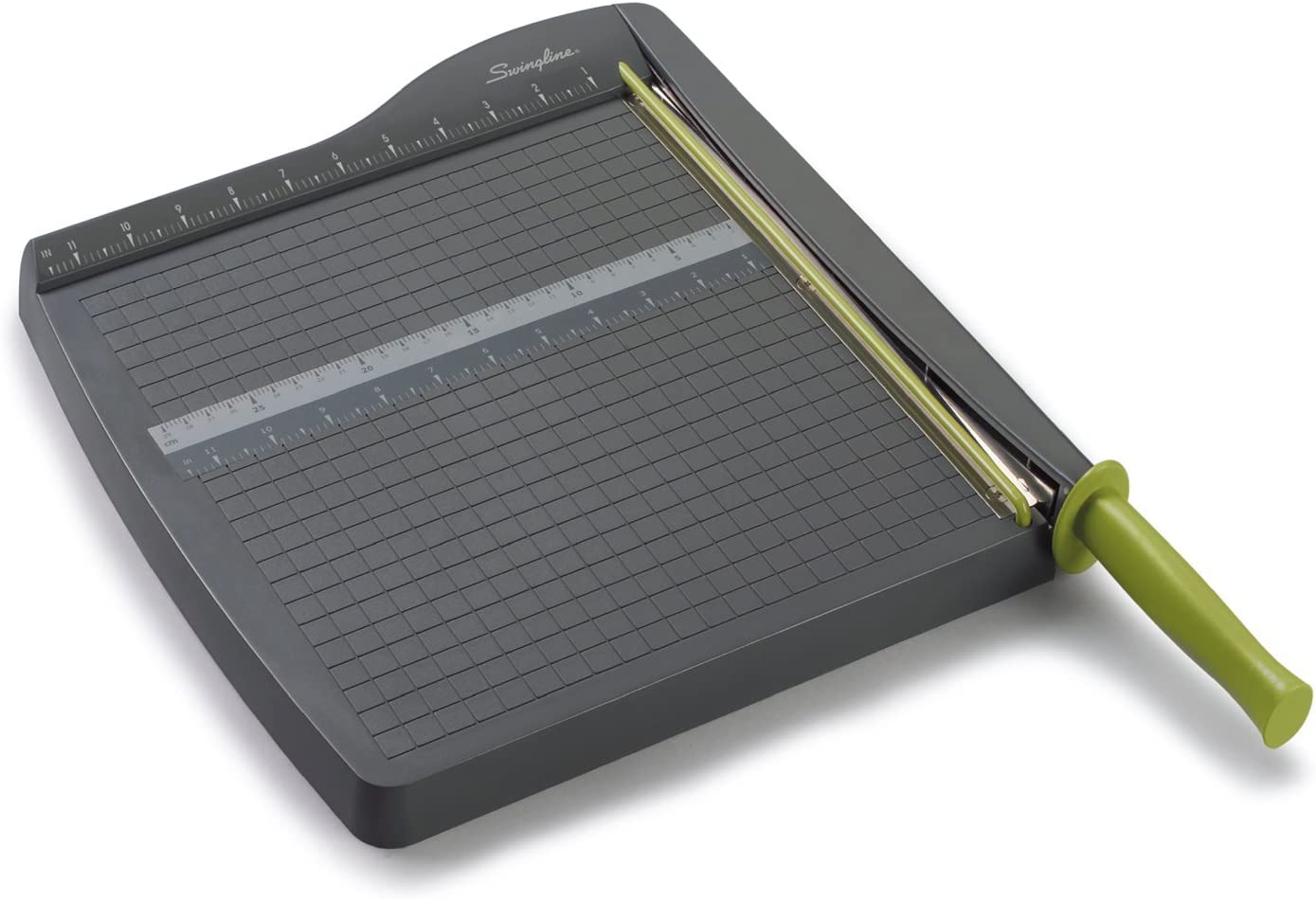 The Swingline ClassicCut Lite Guillotine Trimmer is simple, steady, and precise, with a sharp guillotine blade that cuts through papers with ease and an alignment grid that ensures accuracy. Sturdy trimmer is also light and easily transportable, with a durable plastic base. A 12” cutting length makes it a convenient choice for most general trimming tasks, whether at home or in the office. The trimmer easily cuts paper, photos, and more, cutting up to 10 sheets each time. The alignment grid helps ensure precision. A dual scale ruler, with marks in inches and centimeters, allows for easy measuring, regardless of which system you prefer. Safety features include a guard rail to keep your fingers away from the blade when cutting, and a blade latch hook that secures the arm in a locked position when the trimmer is not in use..