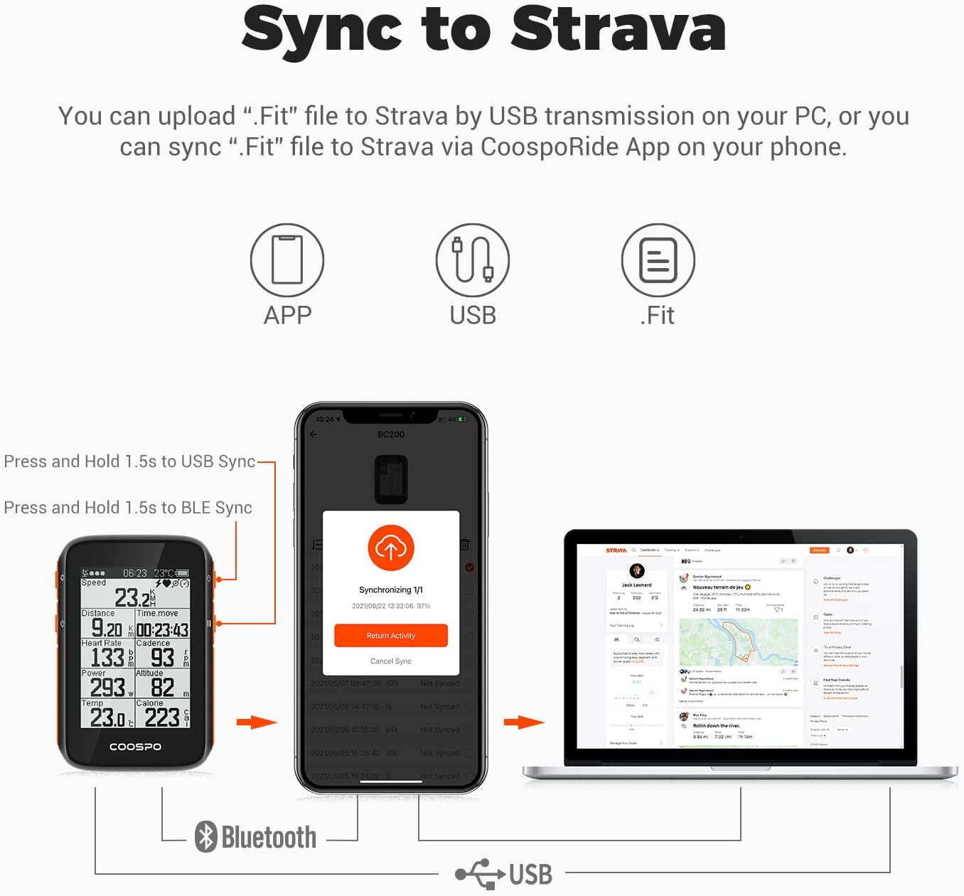 • ✅Sync To Strava-You can upload.Fit file to Strava by USB transmission on your PC, or you can sync.Fit file to Strava via CoospoRide App / XOSS app on your phone by bluetooth. By using CoospoRide app, you can also set CooSpo Bike Computer BC200/BC107/BC26 quickly and use.