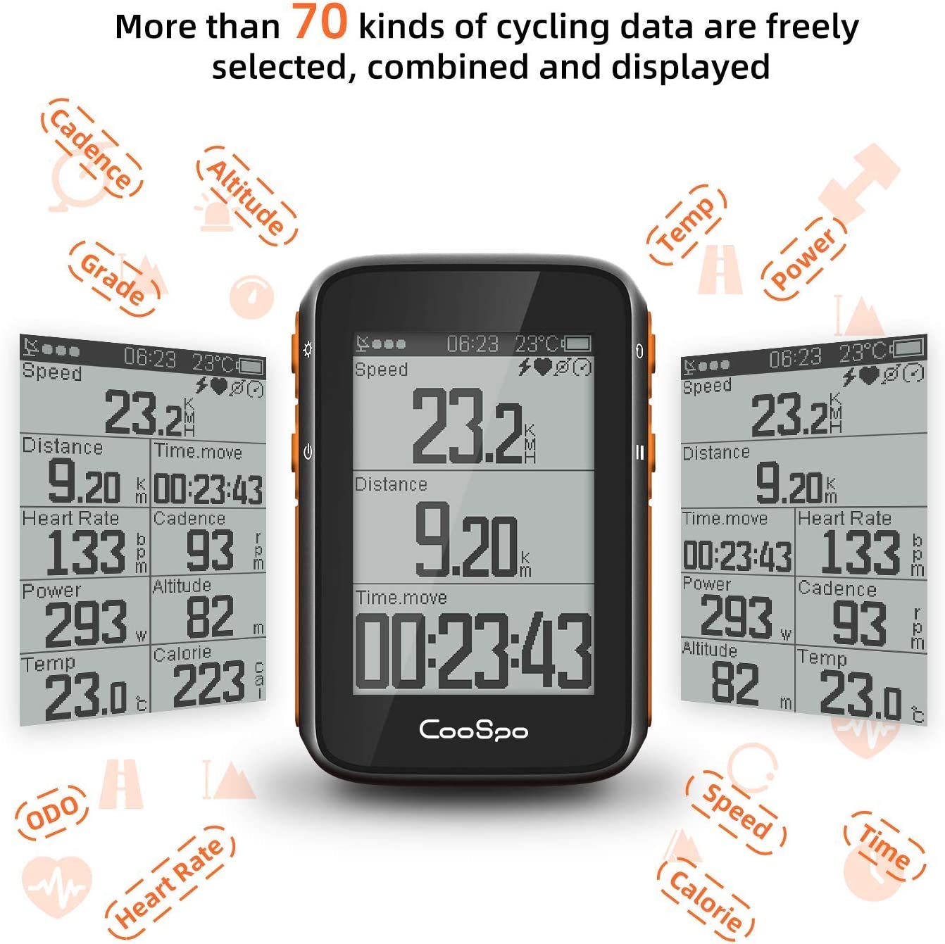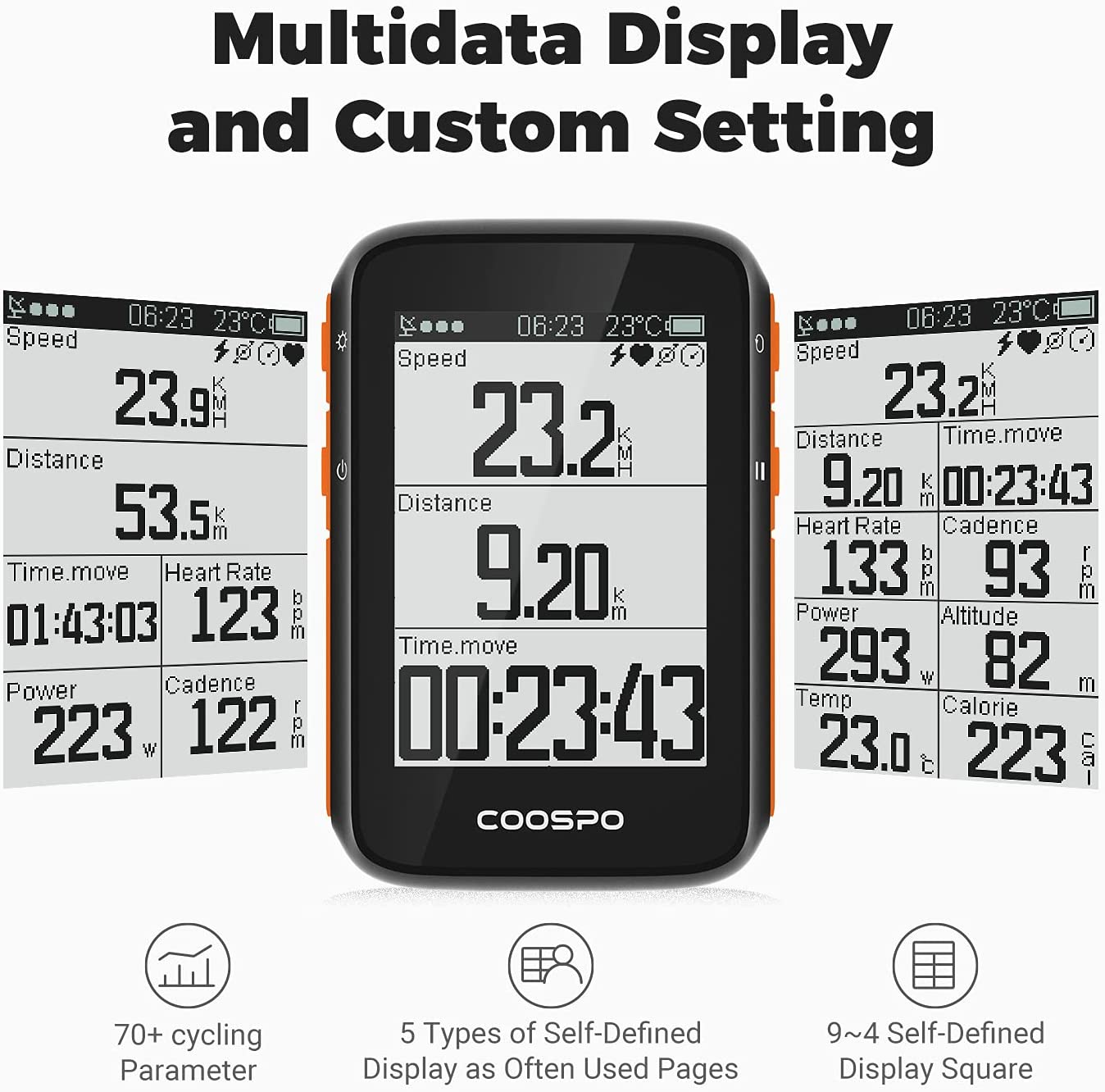 • ✅Multidata & Customied Display Pages-CooSpo bike computer BC200 provides 70+ cycling data for display, including Distance, Time, Altitude, Slope, Temperature, Atmospheric Pressure, Cycling Power and so on, Support customized display pages while cycling, each page can be customized to display 2-9 data types as you like.