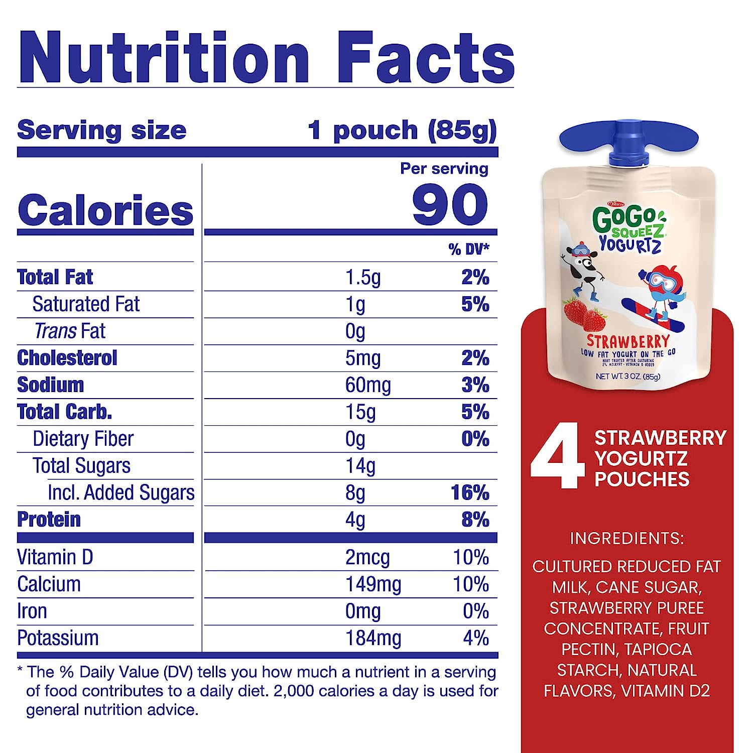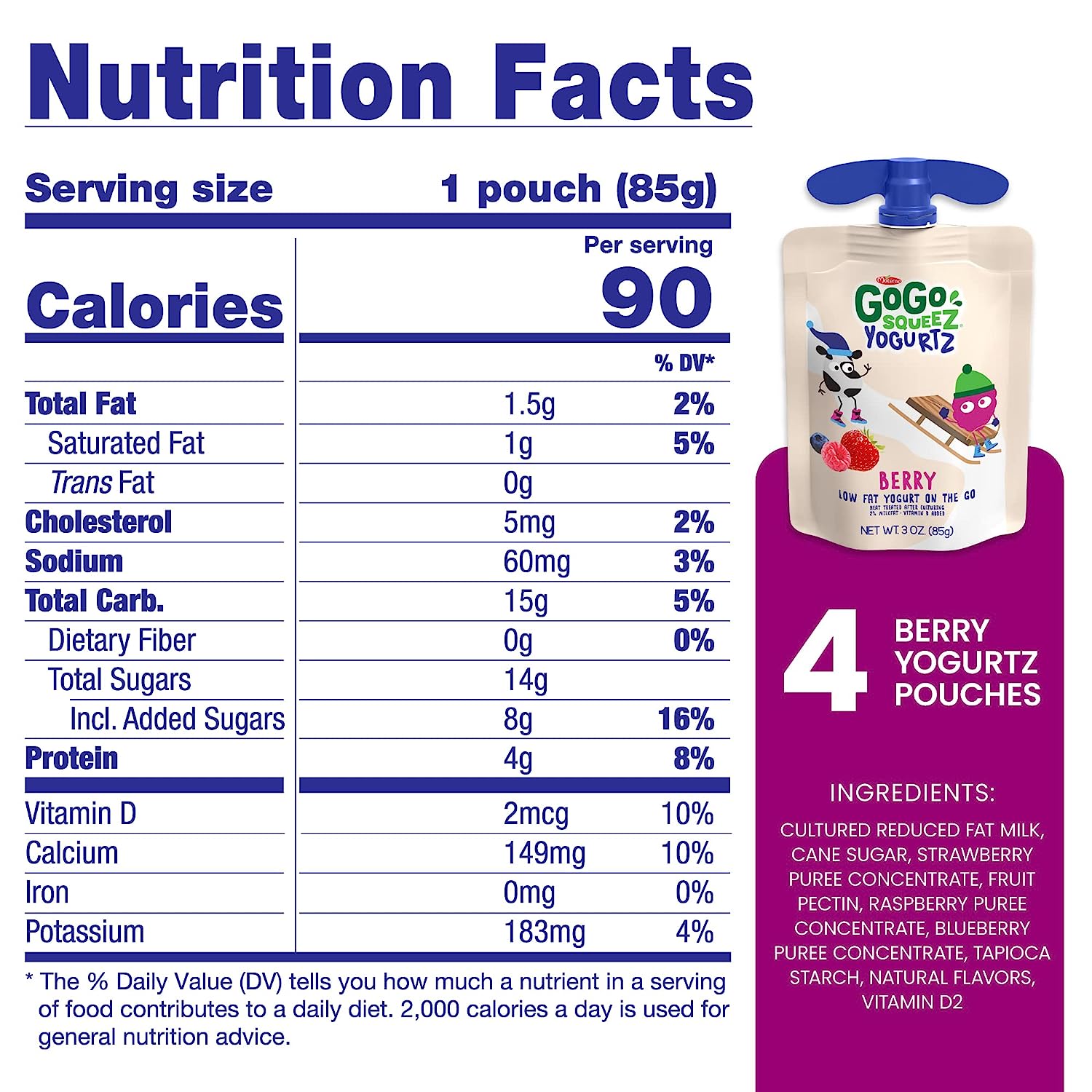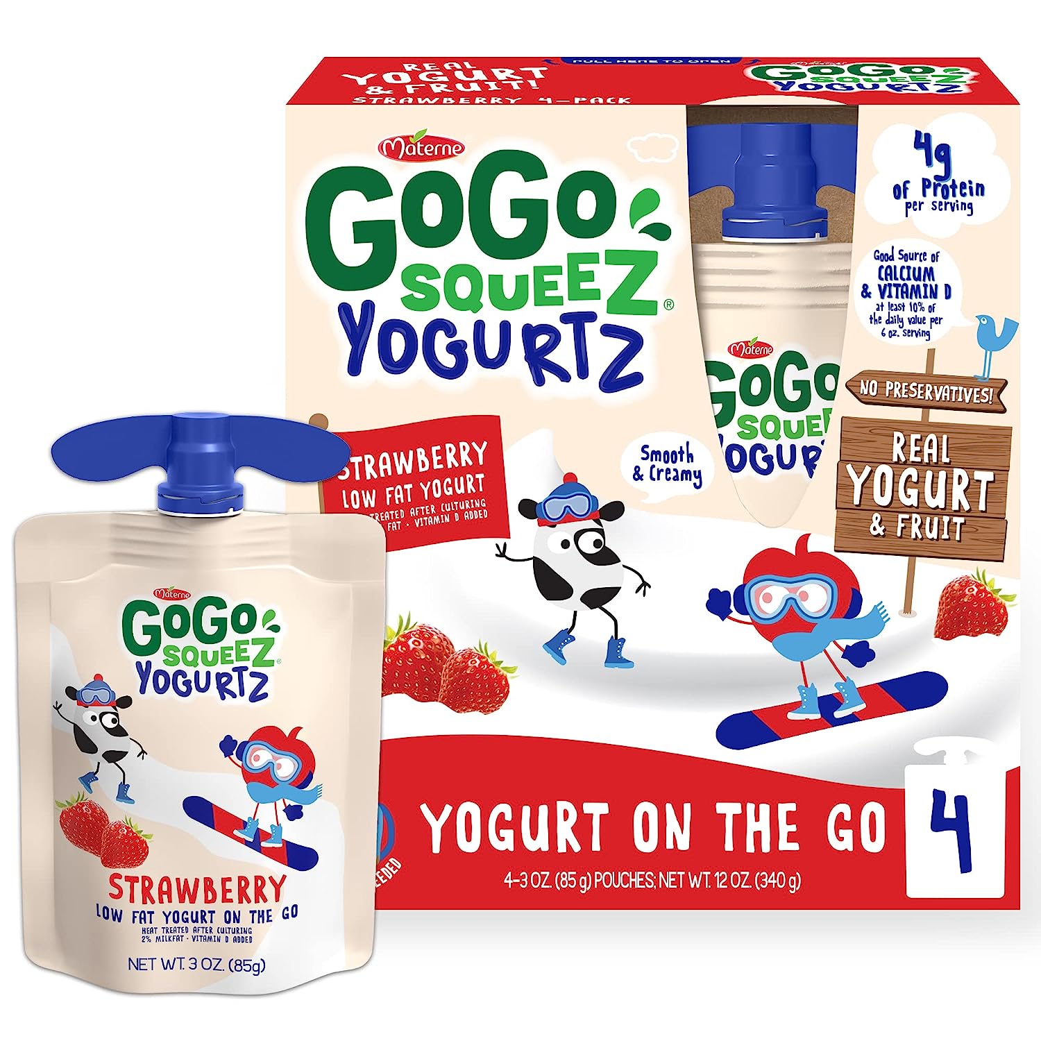 GoGo squeeZ yogurtZ are made with real low fat yogurt and strawberries, never anything artificial. Delivered in our iconic squeezable, portable snack pouches, GoGo squeeZ yogurtZ is safe to store at room temperature until opened. Our kitchen pantry friendly yogurt is a delicious snack with no preservatives and no fridge needed! Our yogurt pouches are kosher certified, nut free and gluten free snacks, are made with no artificial growth hormones like rBST* and are a good source of Calcium and Vitamin D**. At GoGo squeeZ, we’re more than just applesauce pouches; We craft our products with high-quality ingredients for squeeZing and enjoying wherever life takes you. Our products are free of common allergens, so you, your kids and your whole family can enjoy and share GoGo squeeZ snacks without worry. *Made with milk from cows not treated with hormones like rBST. No significant difference has been shown between milk from rBST-treated and non-rBST-treated cows. **At Least 10% Of The Daily Value Per 6 Oz