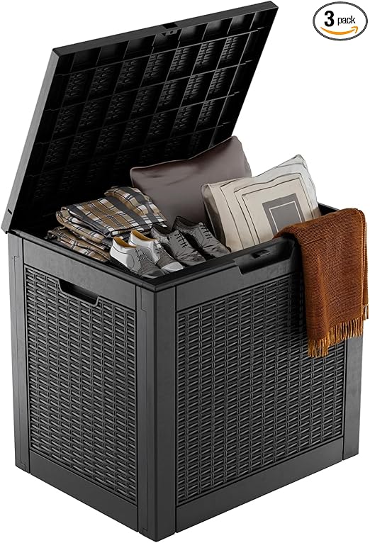 31 Gallon Waterproof Outdoor Resin Deck Box with Lockable Lid, Stylish Wicker Pattern, Easy Assembly Features and Convenient Handles For Patio Cushion, and other Patio Furniture (Black)