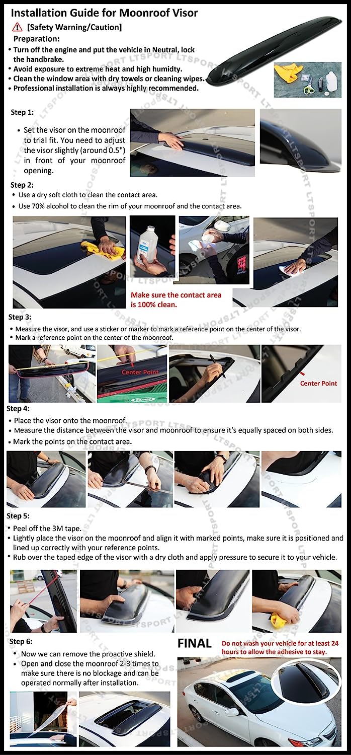 • Simple Installation Steps: Direct Tape-On Design. (Before install the item, make sure the apply surface 100% clean. Double sided tape cannot be re-apply/reuse once it has been placed onto the vehicle. Position the sunroof visor and align it correctly before removing the red plastic. In case place it wrong position will require to replace a brand new double side tape to re-adhere. Do not wash your vehicle for at least 24 hours to allow the adhesive to stay.